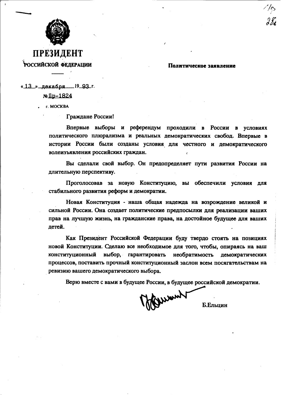 Политическое заявление Президента Российской Федерации Б.Н.Ельцина в связи с принятием Конституции Российской Федерации. 13 декабря 1993 г. Копия