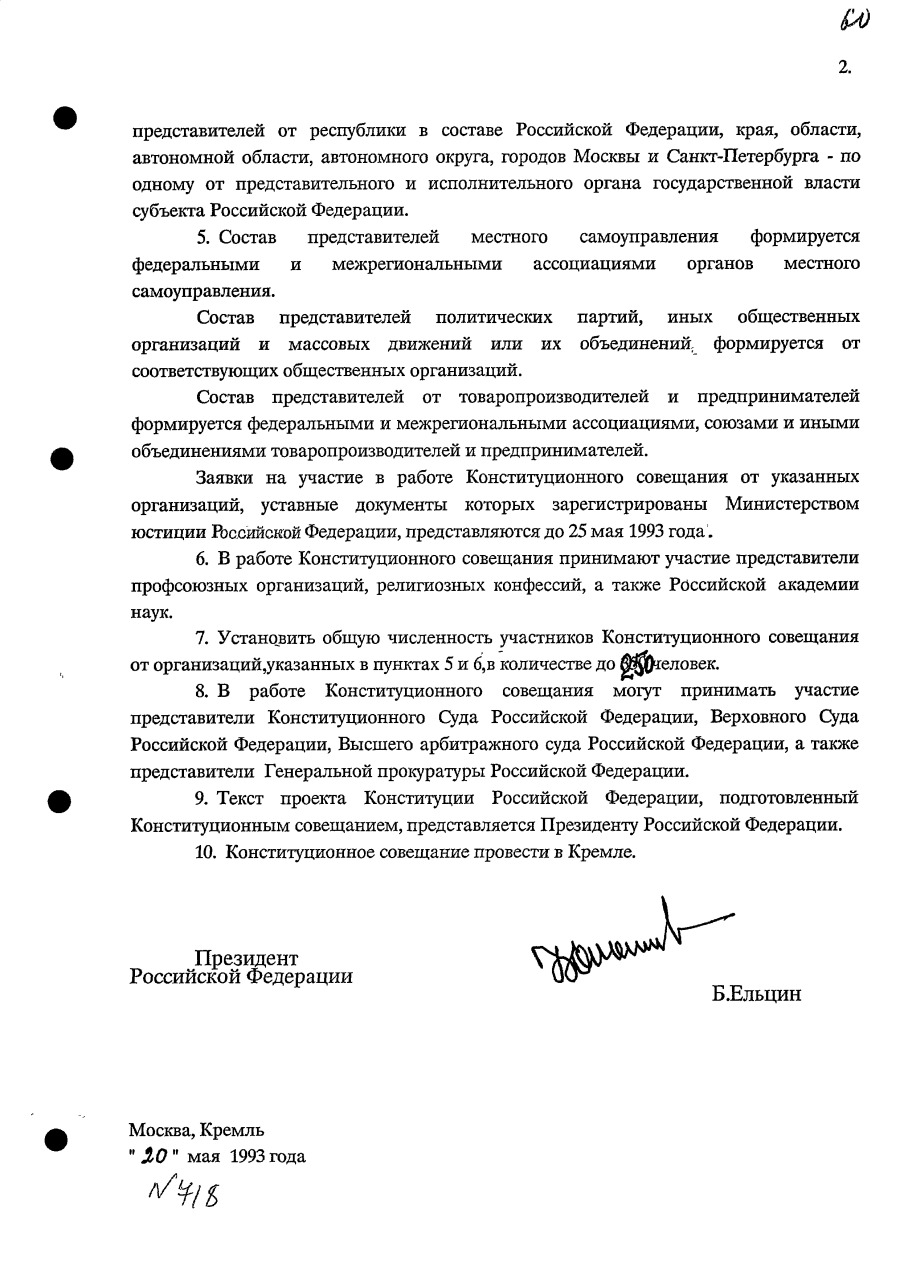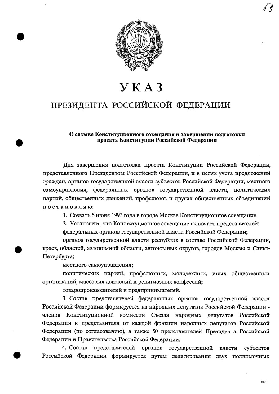 Указ Президента Российской Федерации № 718 «О созыве Конституционного совещания и завершении подготовки проекта Конституции Российской Федерации». 20 мая 1993 г.
