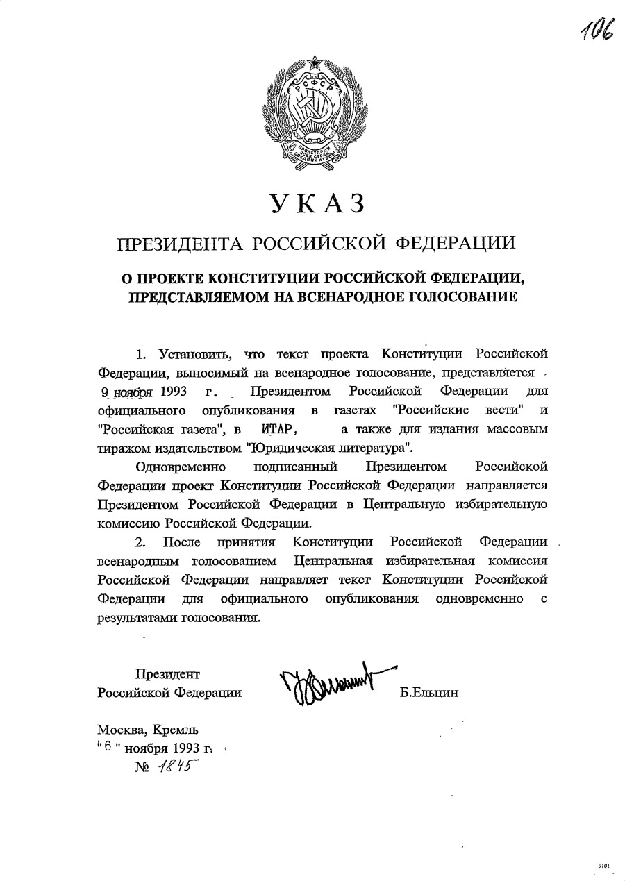 Указ Президента Российской Федерации № 1845 «О проекте Конституции Российской Федерации представляемом на всенародное голосование». 6 ноября 1993 г.