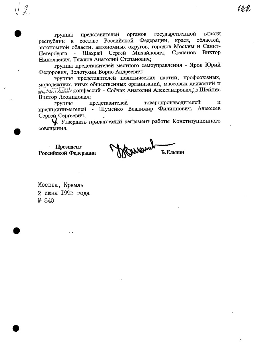 Указ Президента Российской Федерации № 840 «О порядке работы Конституционного совещания» с личной правкой. 2 июня 1993 г.