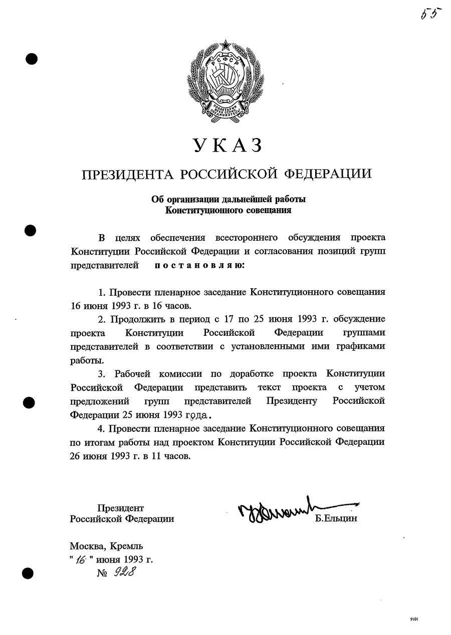 Указ Президента Российской Федерации № 928 «Об организации дальнейшей работы Конституционного совещания». 16 июня 1993 г.