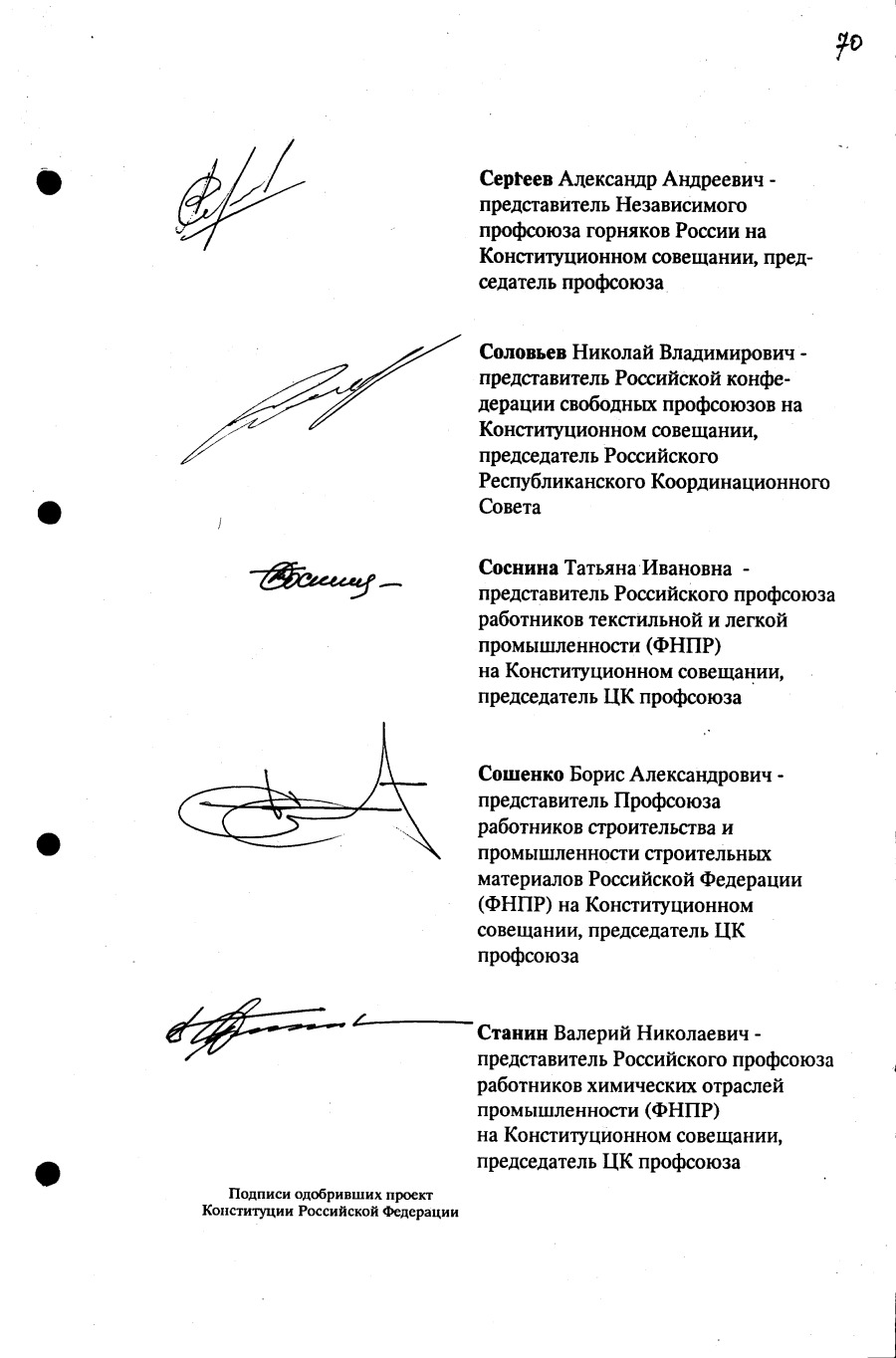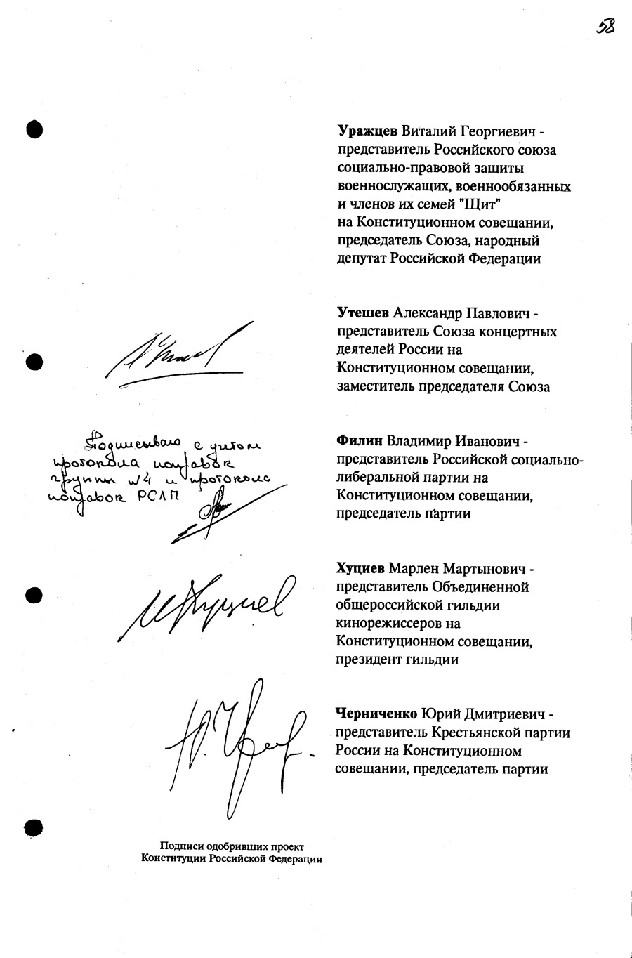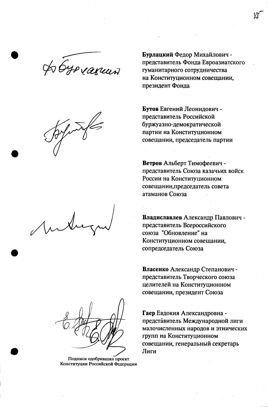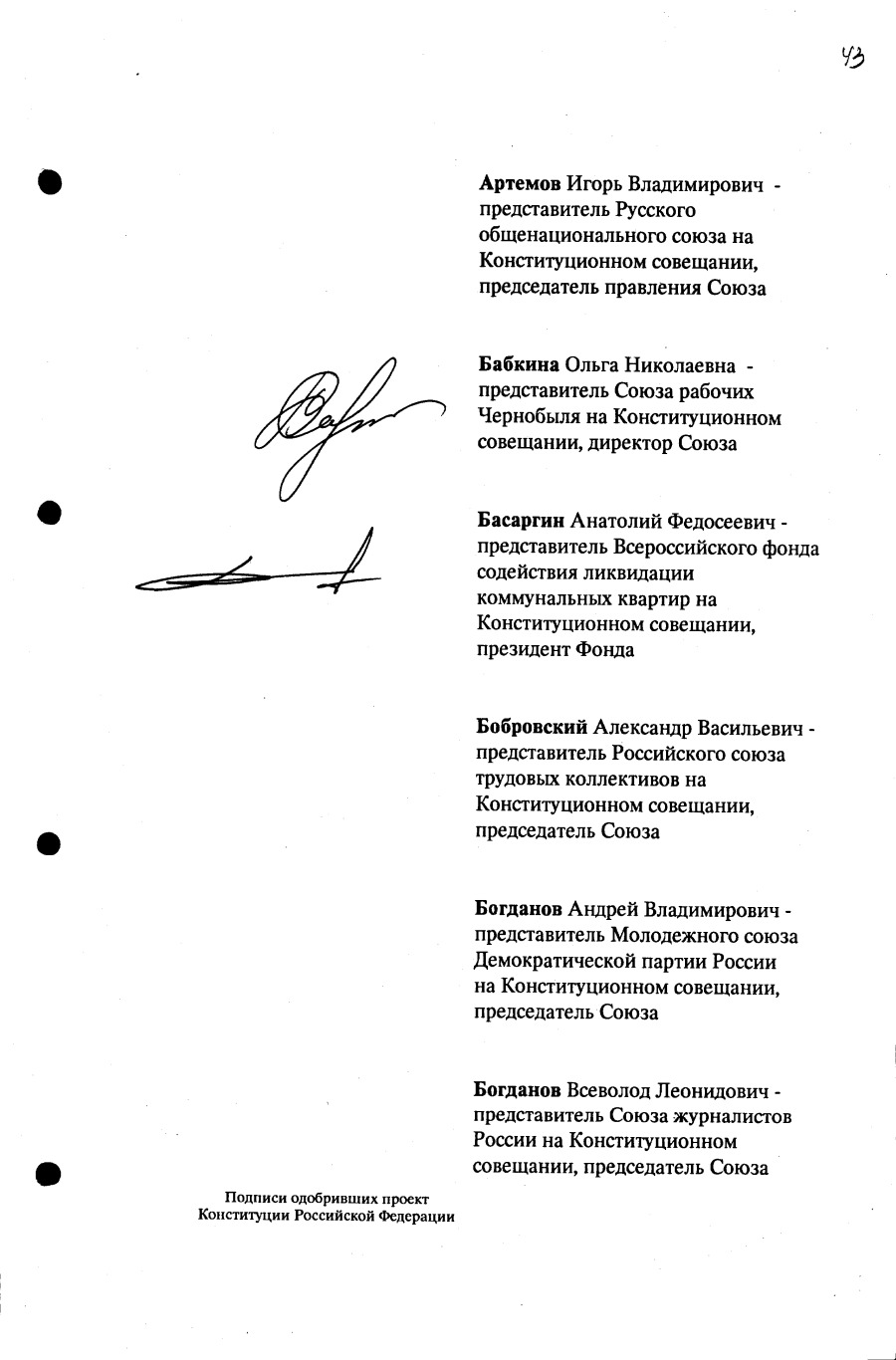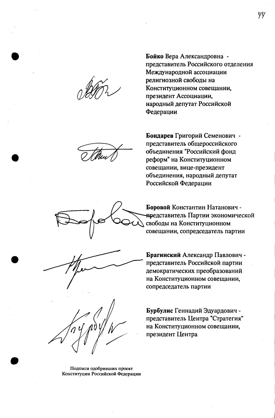 Проект Конституции РФ и подписи участников Конституционного совещания, одобривших этот проект 12 июля 1993 года (Представители политических партий, иных общественных организаций и массовых движений, профсоюзных организаций, религиозных конфессий)