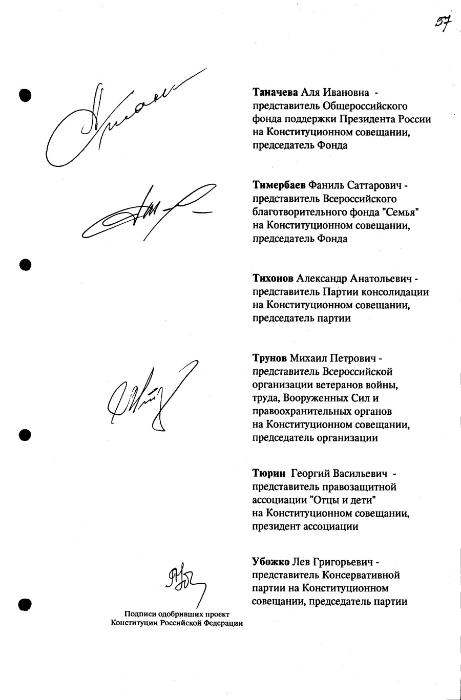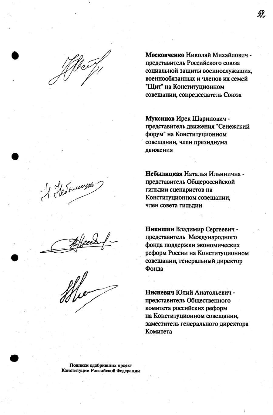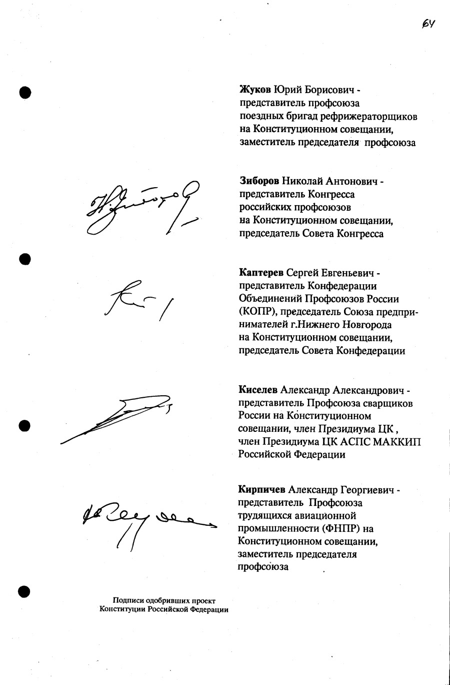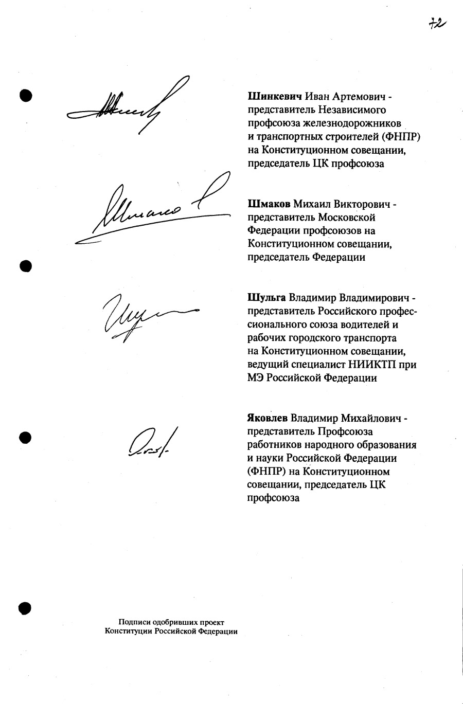 Проект Конституции РФ и подписи участников Конституционного совещания, одобривших этот проект 12 июля 1993 года (Представители политических партий, иных общественных организаций и массовых движений, профсоюзных организаций, религиозных конфессий)