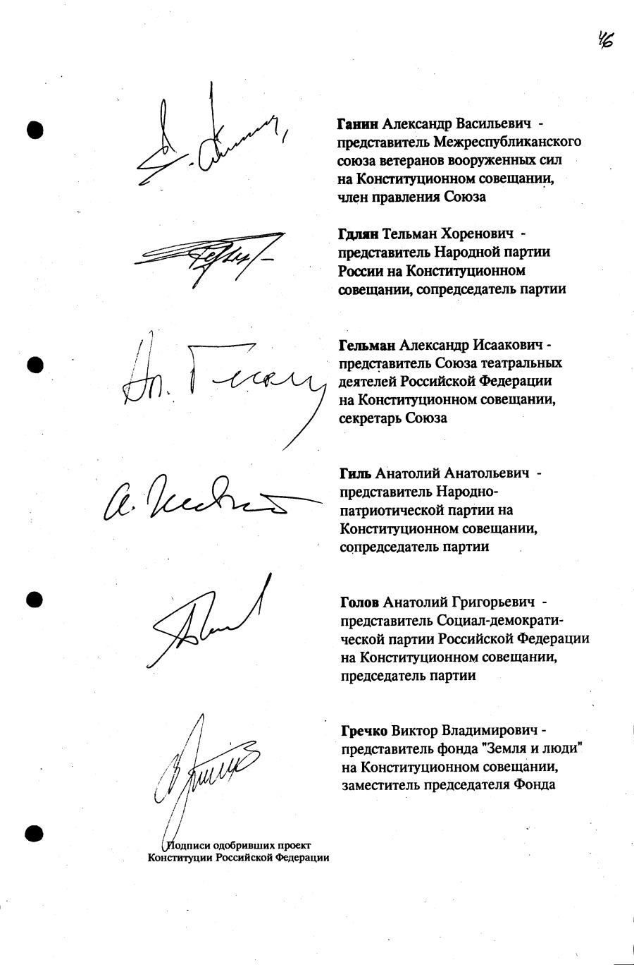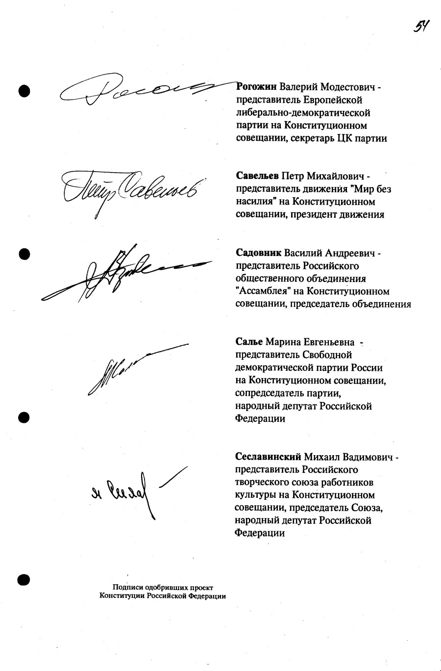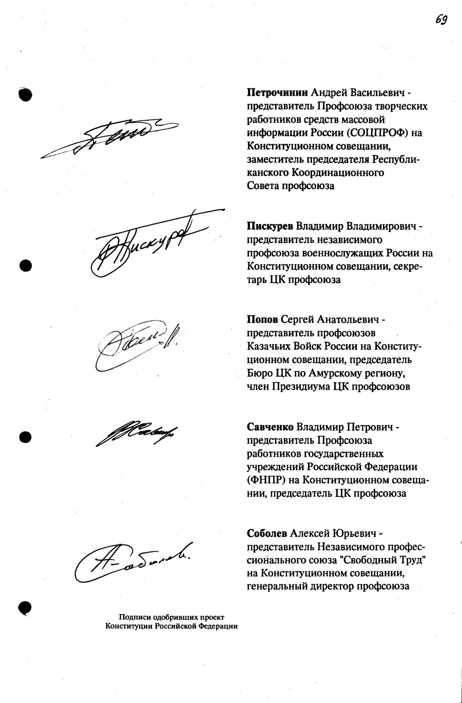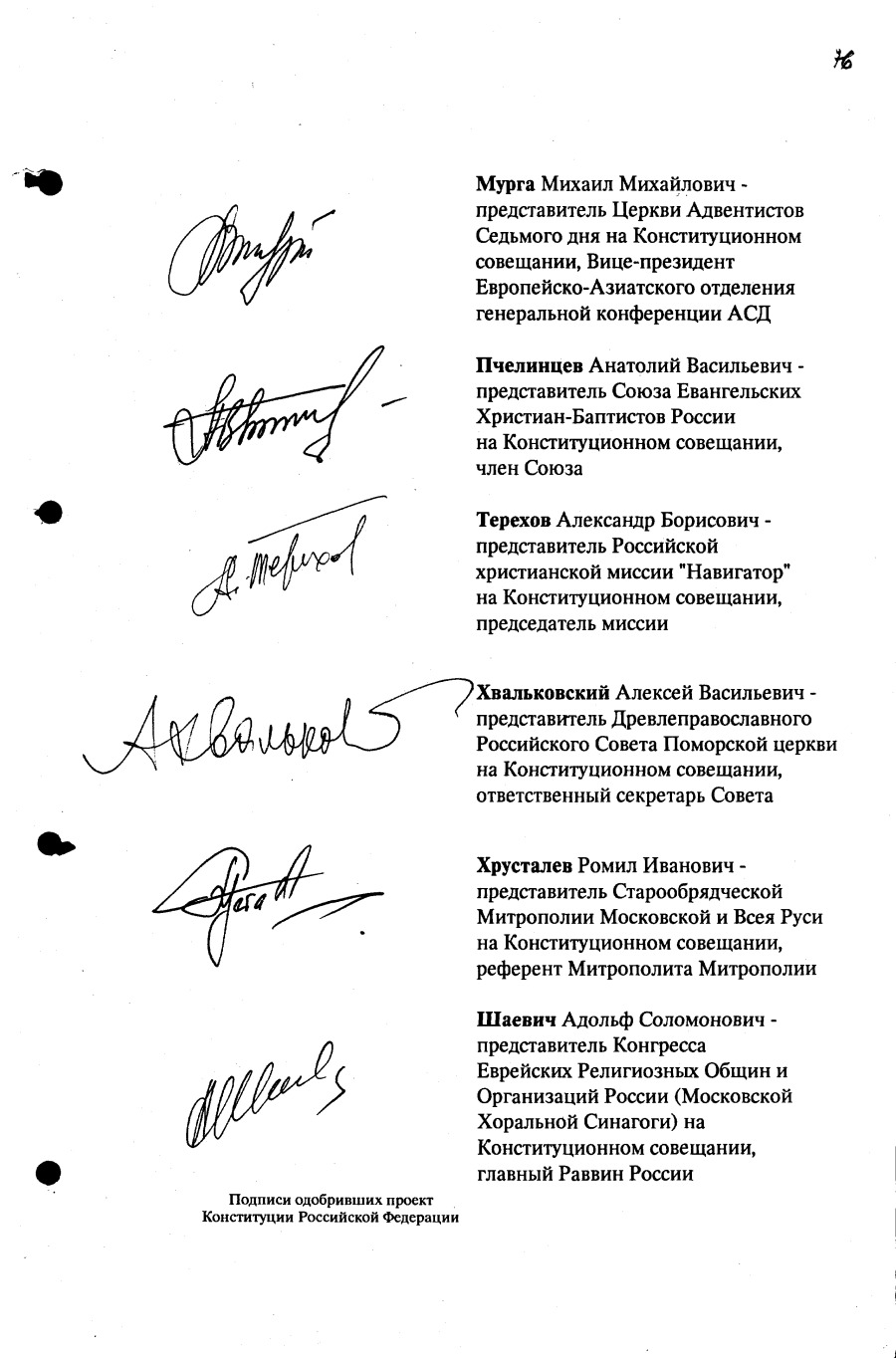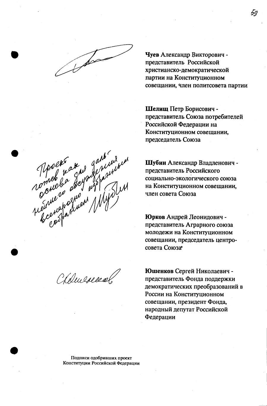 Проект Конституции РФ и подписи участников Конституционного совещания, одобривших этот проект 12 июля 1993 года (Представители политических партий, иных общественных организаций и массовых движений, профсоюзных организаций, религиозных конфессий)