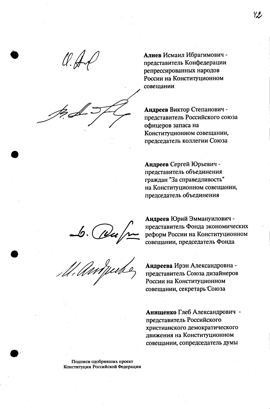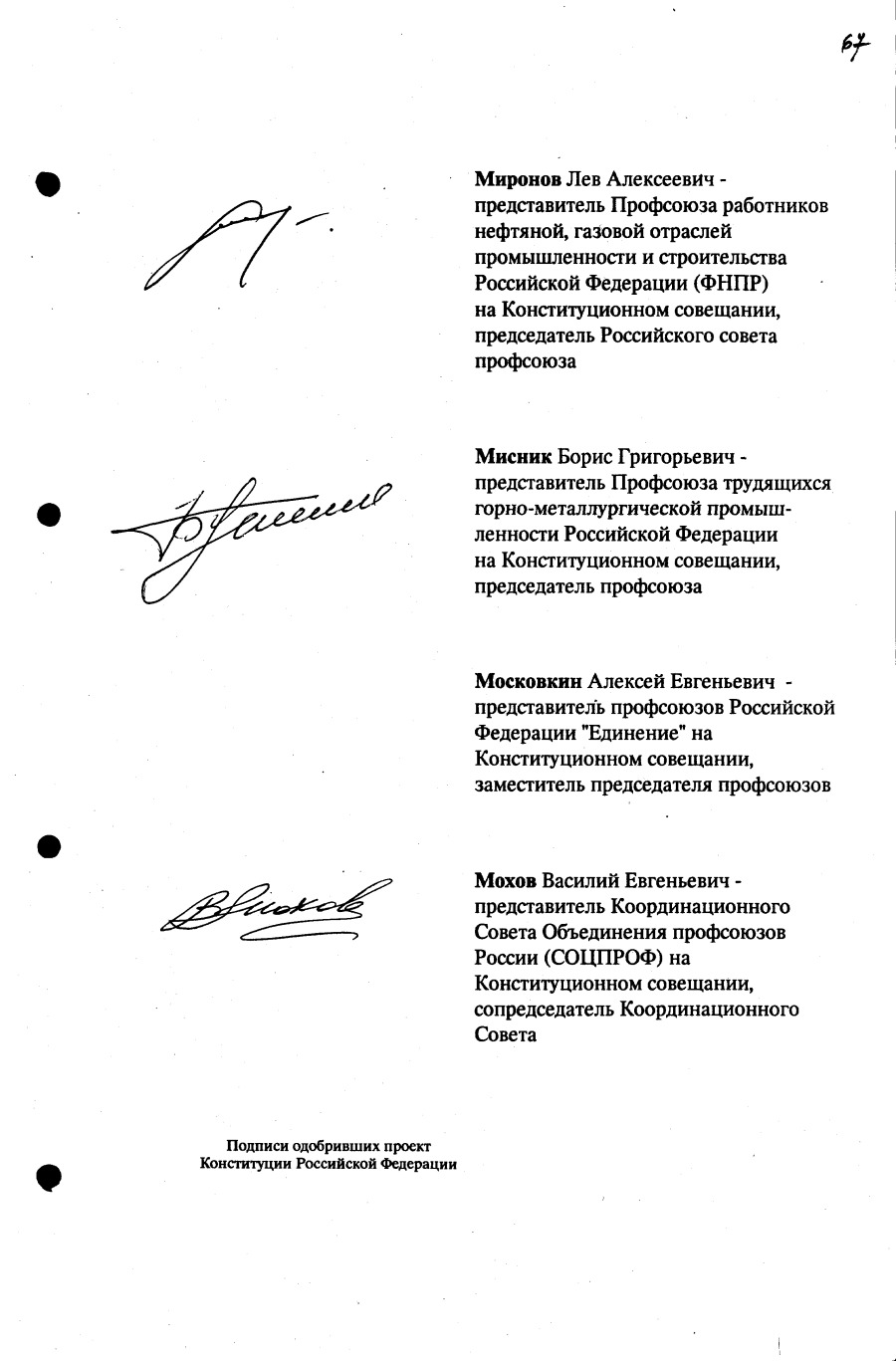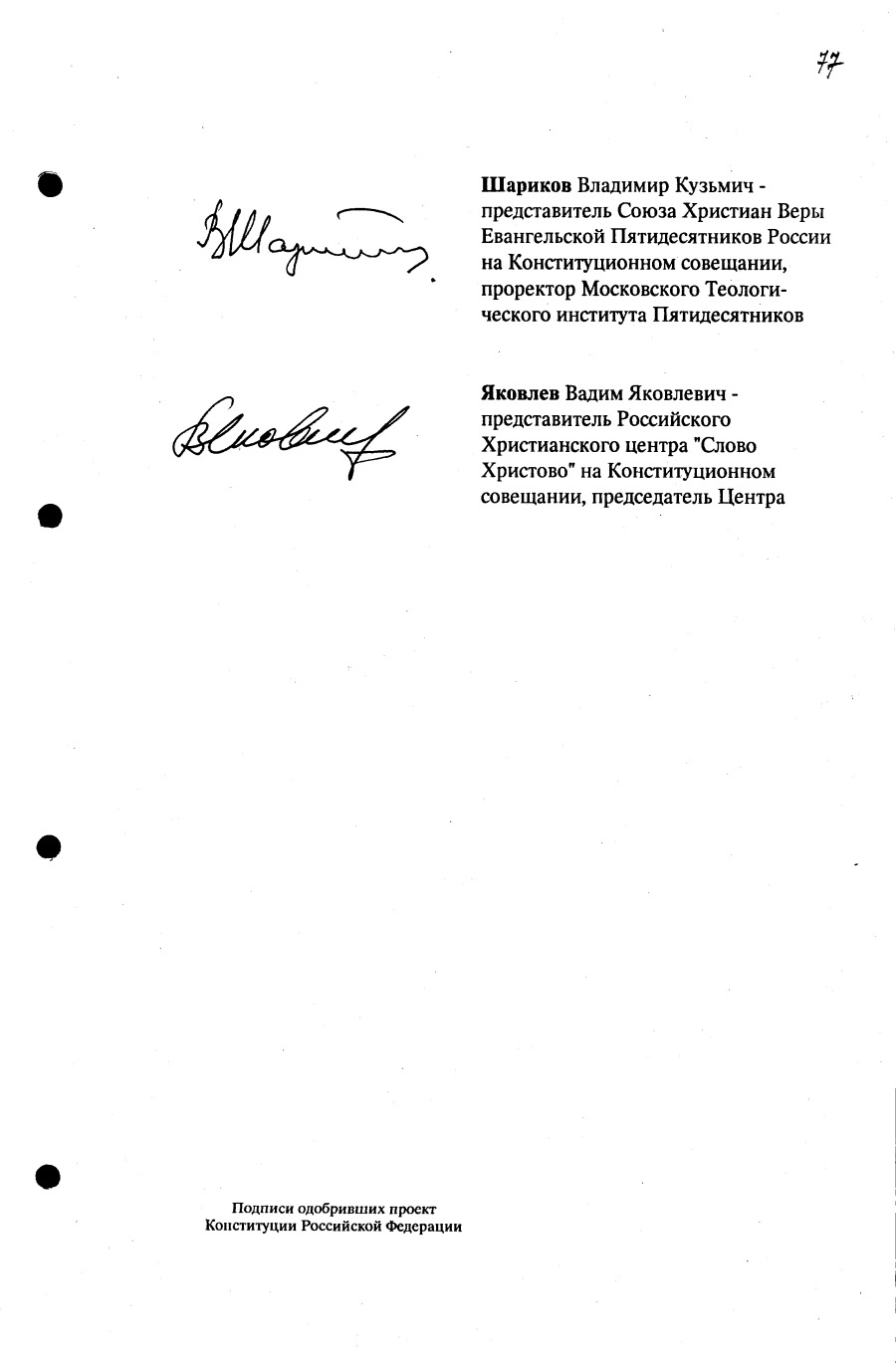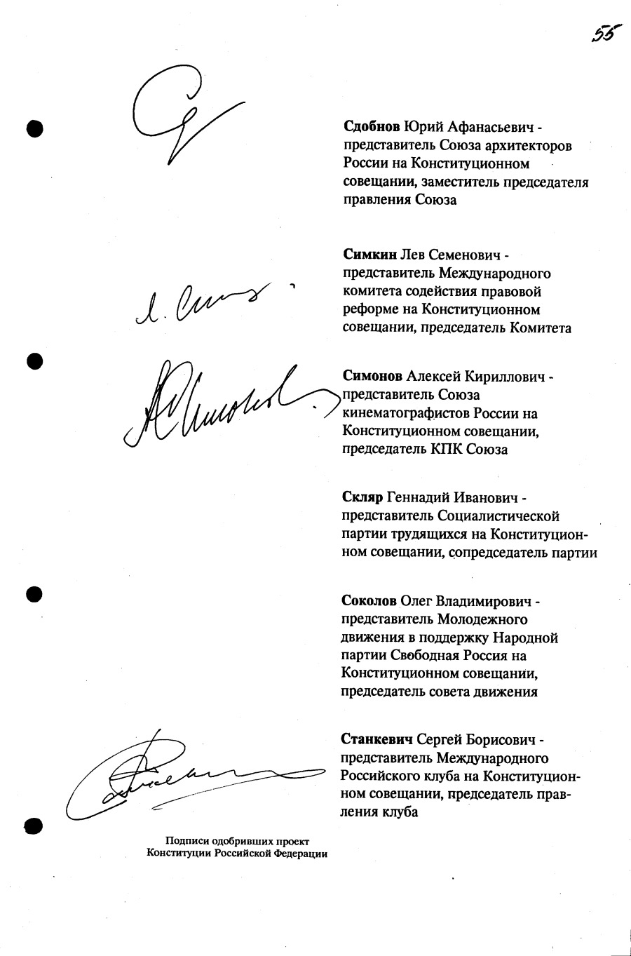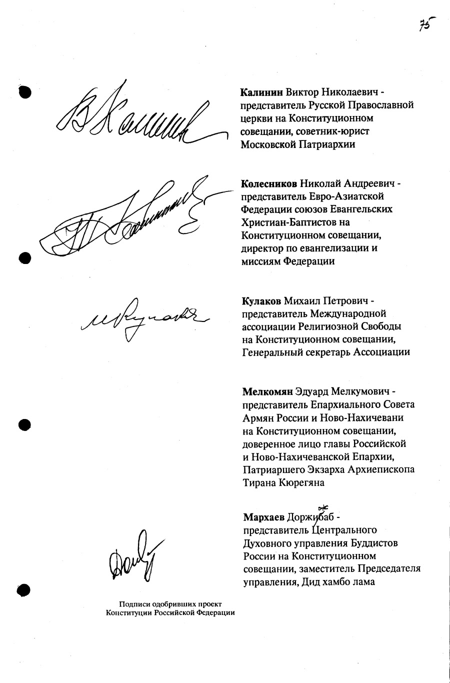 Проект Конституции РФ и подписи участников Конституционного совещания, одобривших этот проект 12 июля 1993 года (Представители политических партий, иных общественных организаций и массовых движений, профсоюзных организаций, религиозных конфессий)