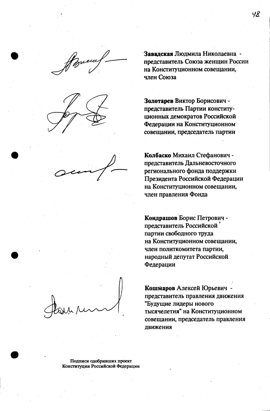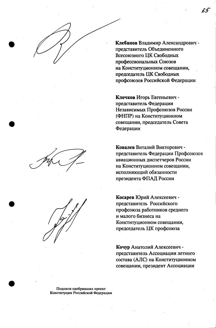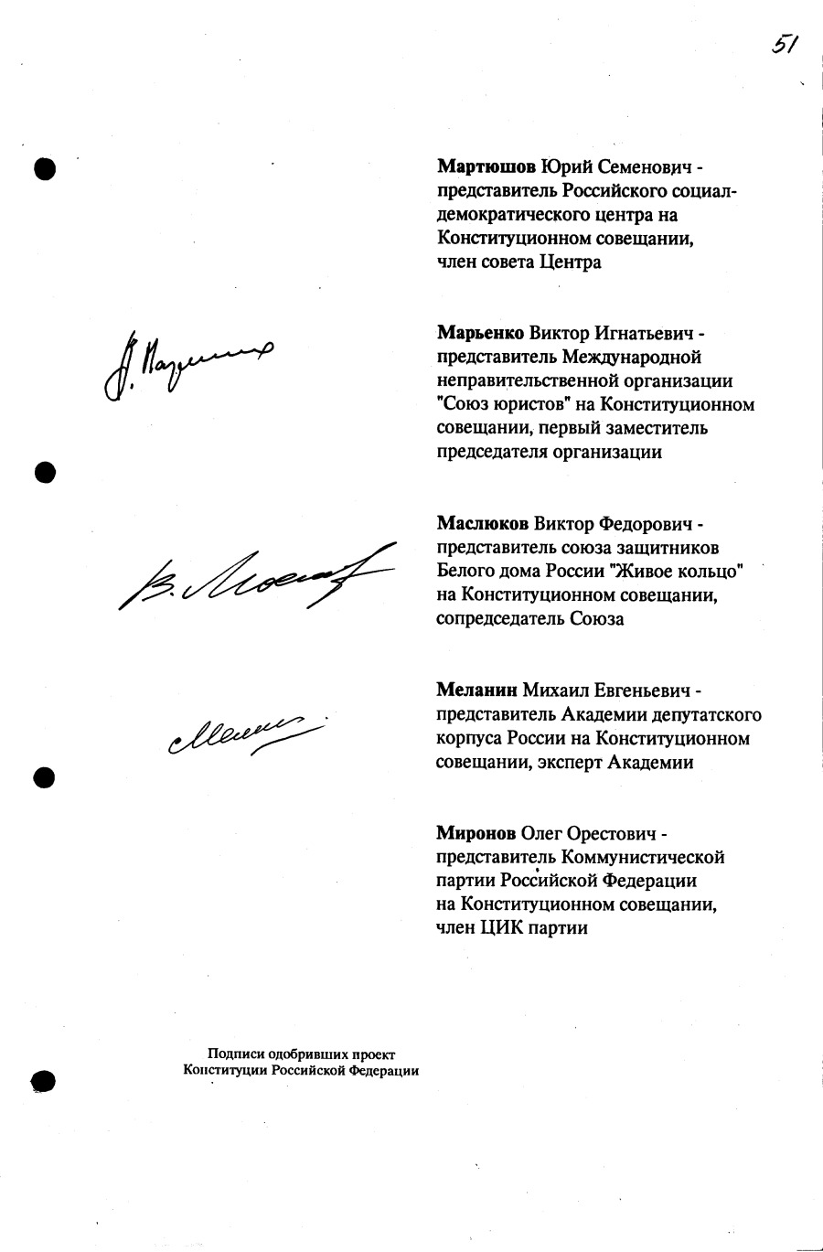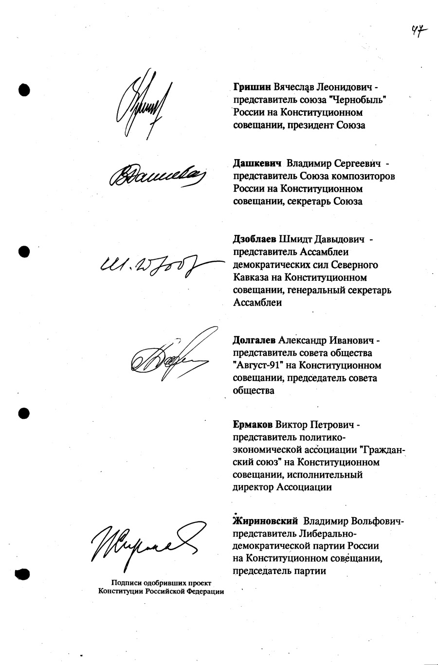 Проект Конституции РФ и подписи участников Конституционного совещания, одобривших этот проект 12 июля 1993 года (Представители политических партий, иных общественных организаций и массовых движений, профсоюзных организаций, религиозных конфессий)