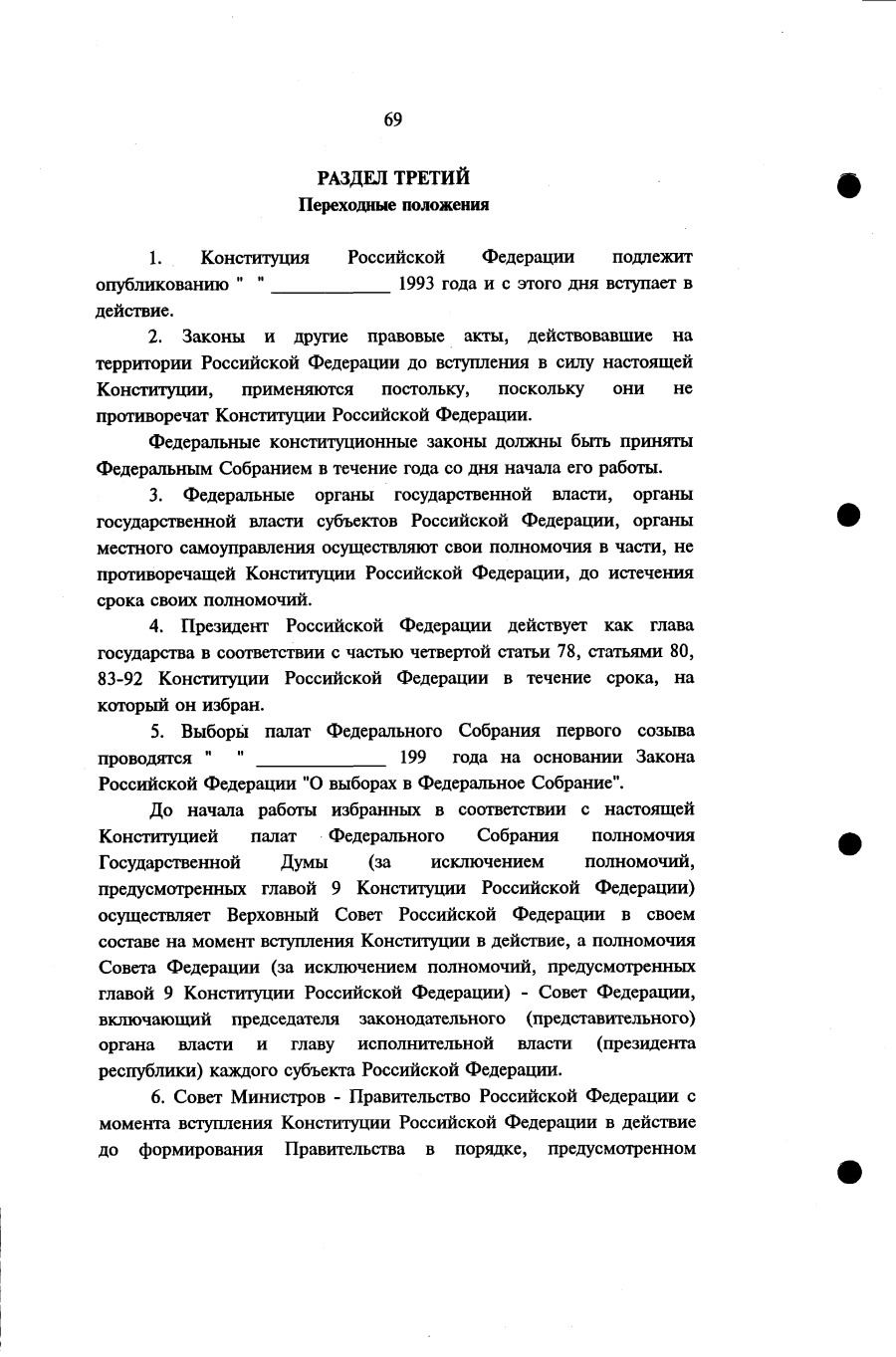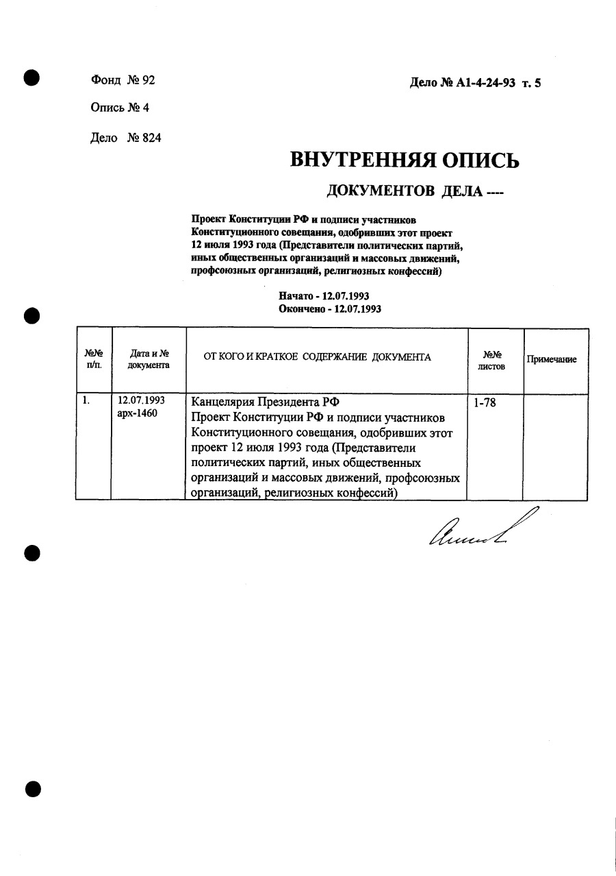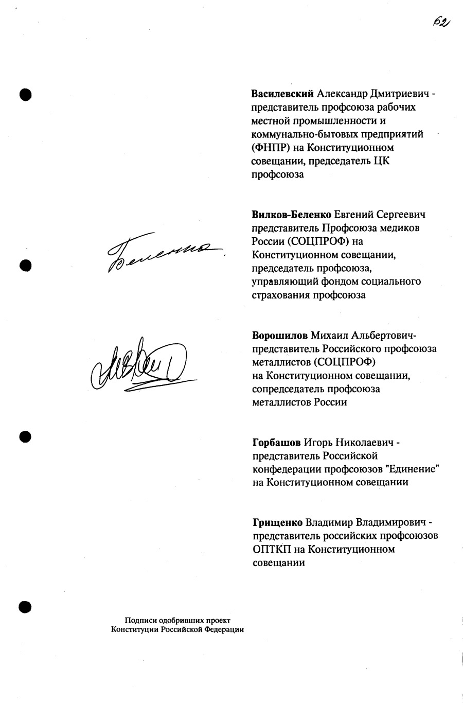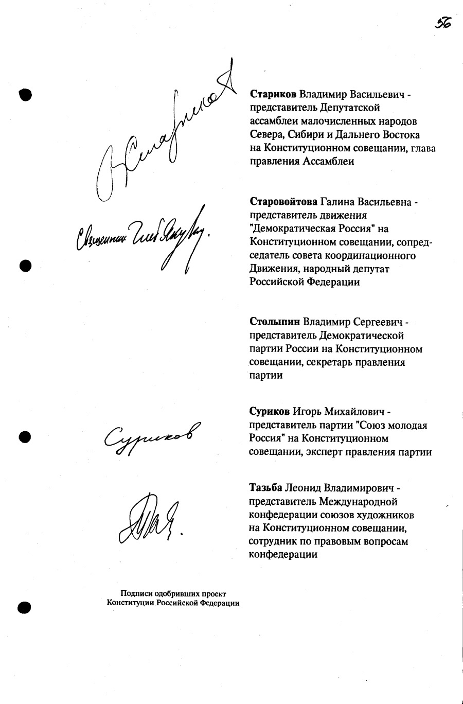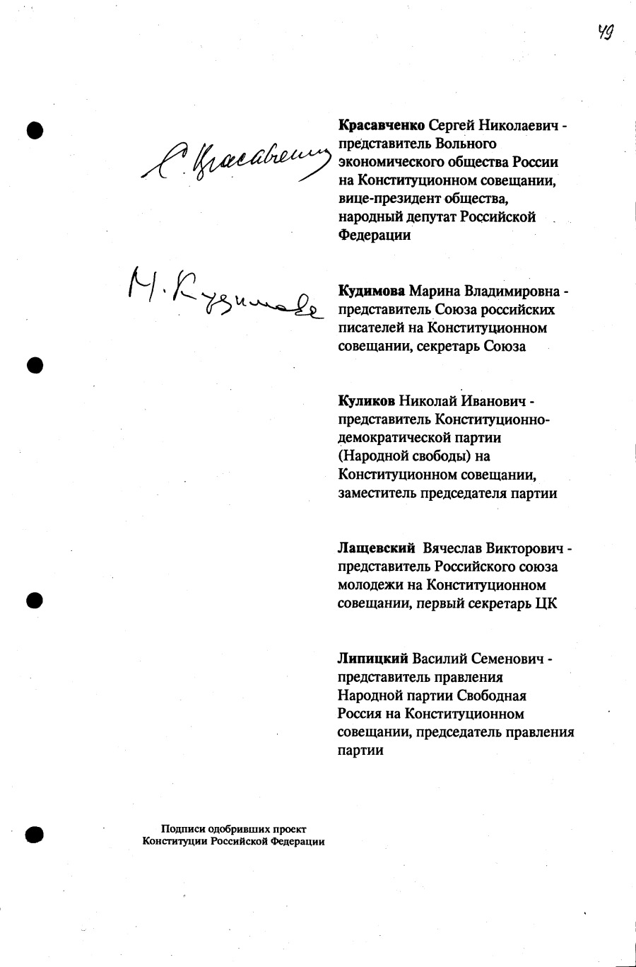 Проект Конституции РФ и подписи участников Конституционного совещания, одобривших этот проект 12 июля 1993 года (Представители политических партий, иных общественных организаций и массовых движений, профсоюзных организаций, религиозных конфессий)