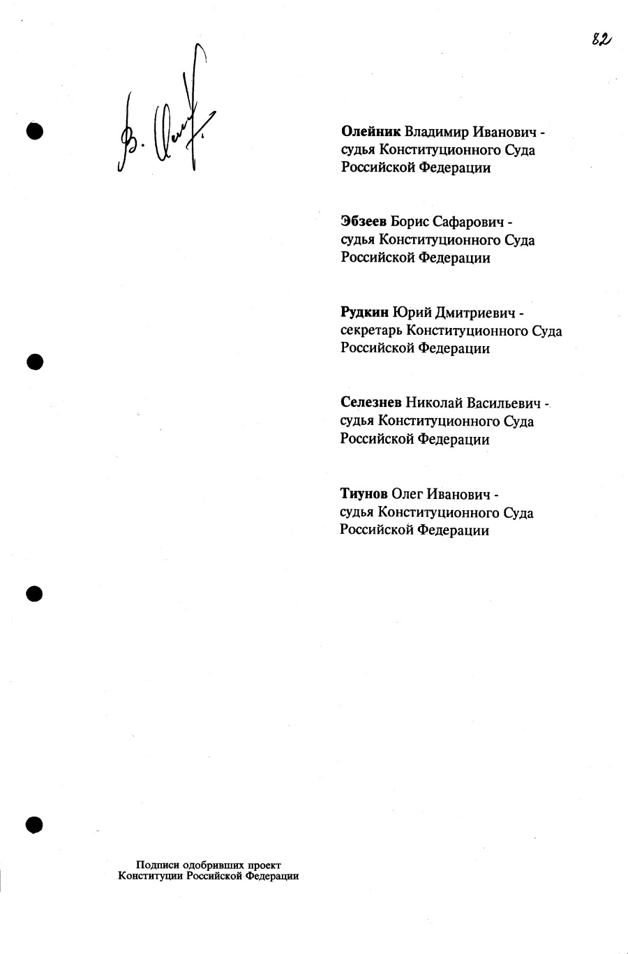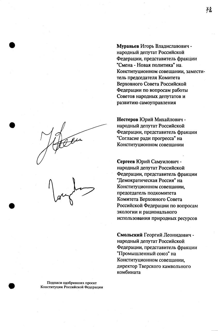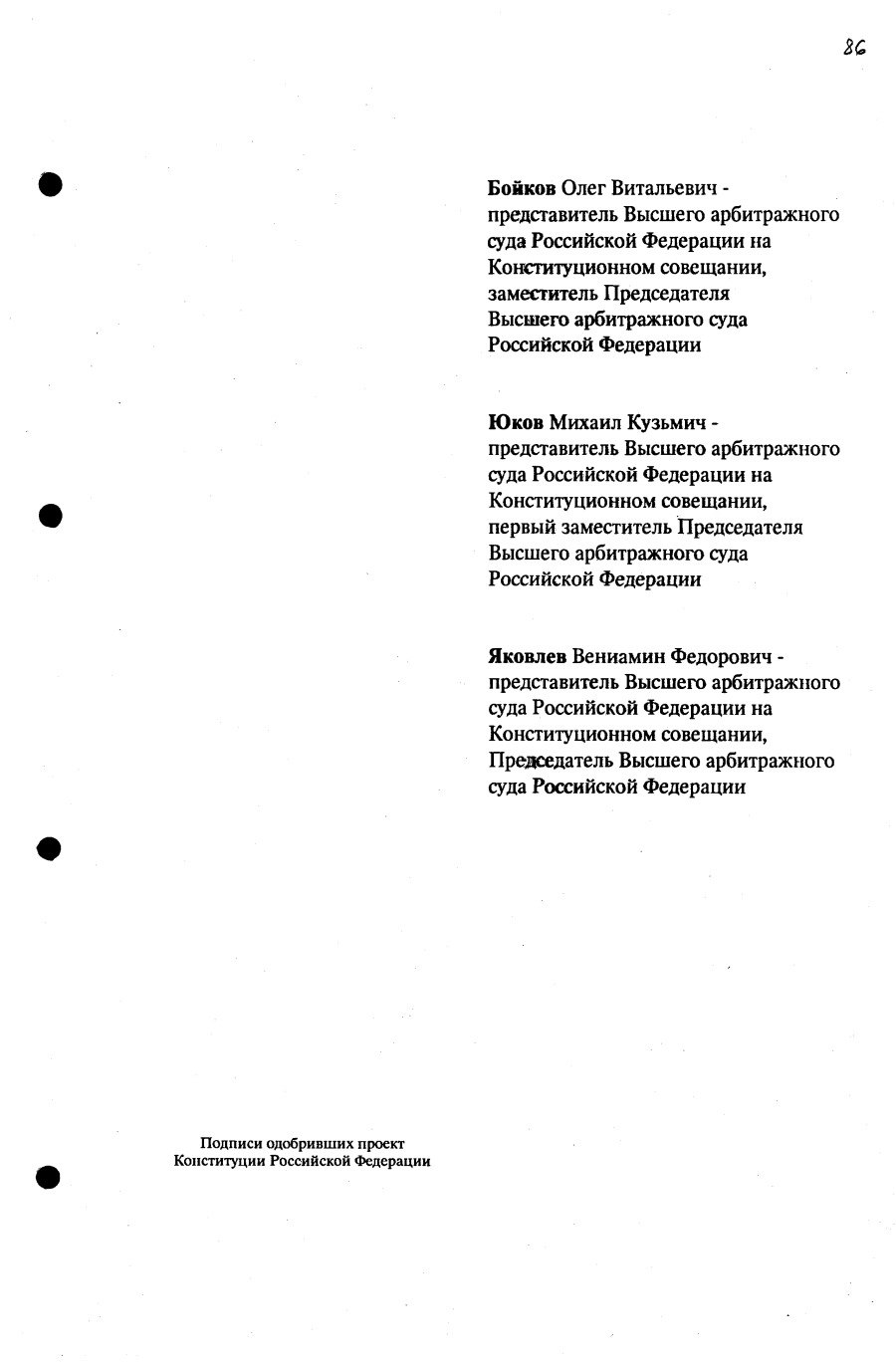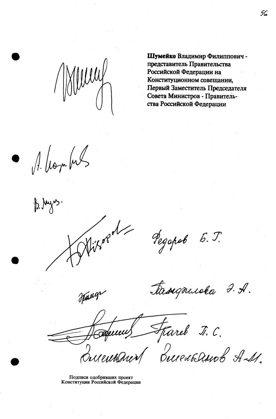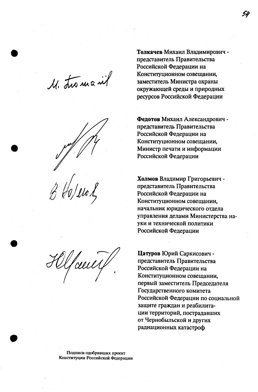 Проект Конституции РФ и подписи участников Конституционного совещания, одобривших этот проект 12 июля 1993 года (Президент РФ, Председатель ВС РФ, Председатель Конституционного Суда РФ, представители Президента РФ и СМ-Правительства РФ, народные депутаты)