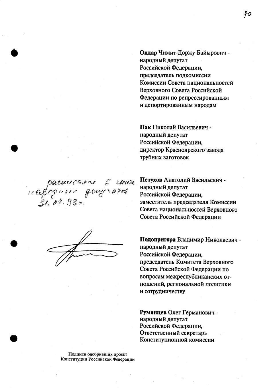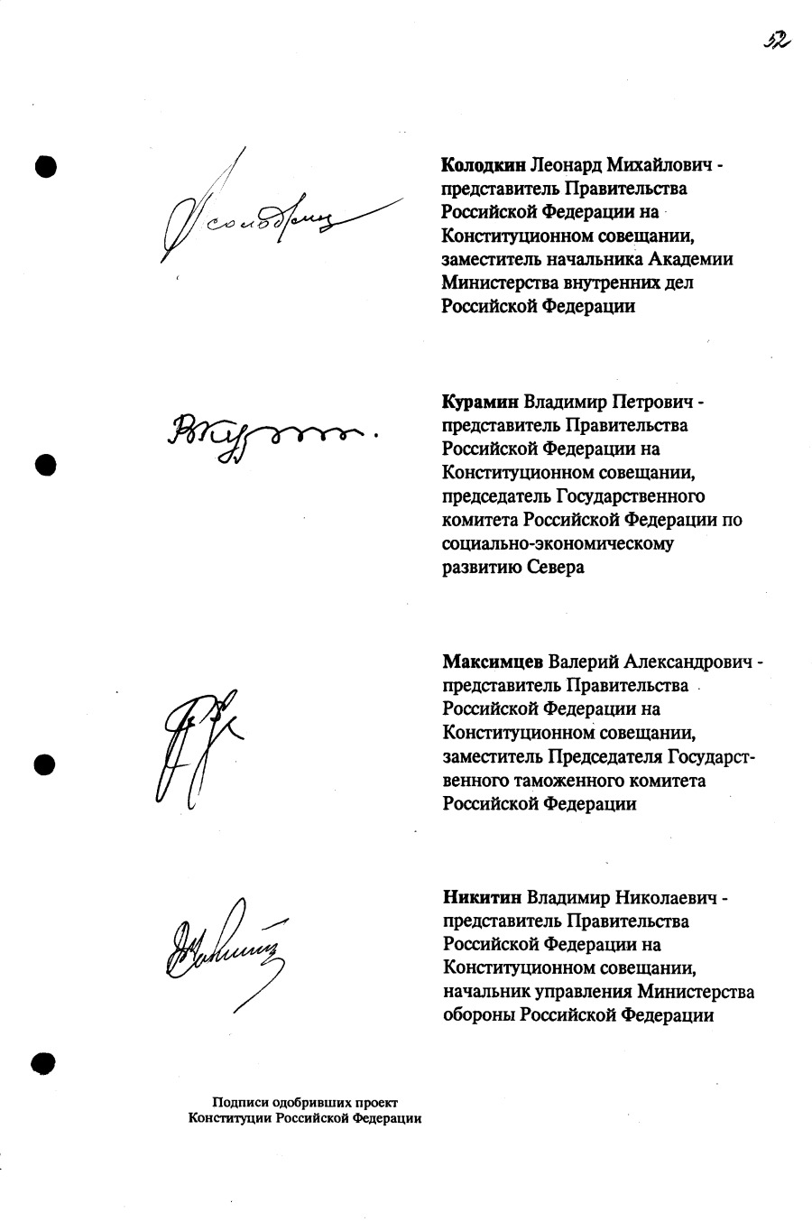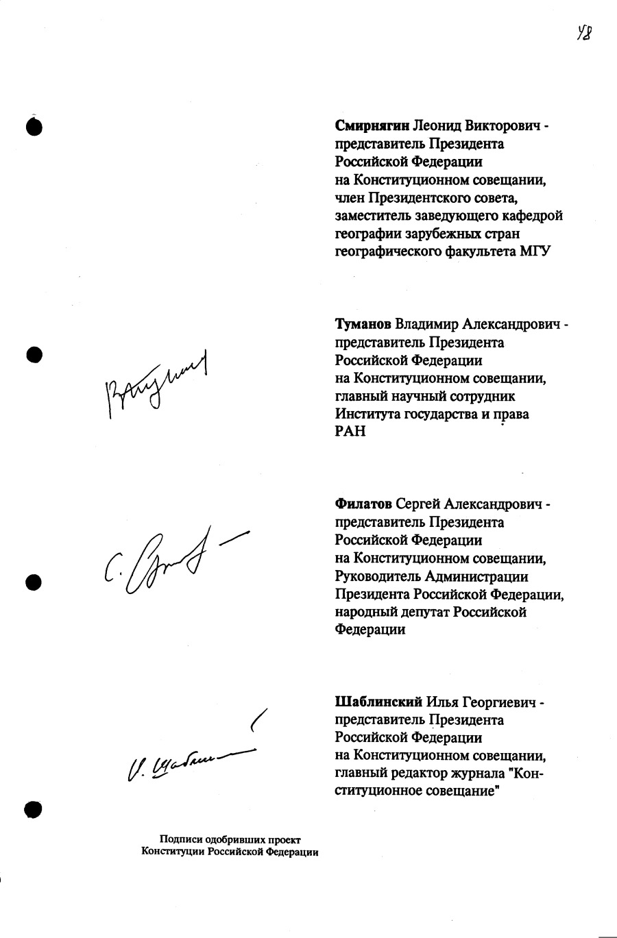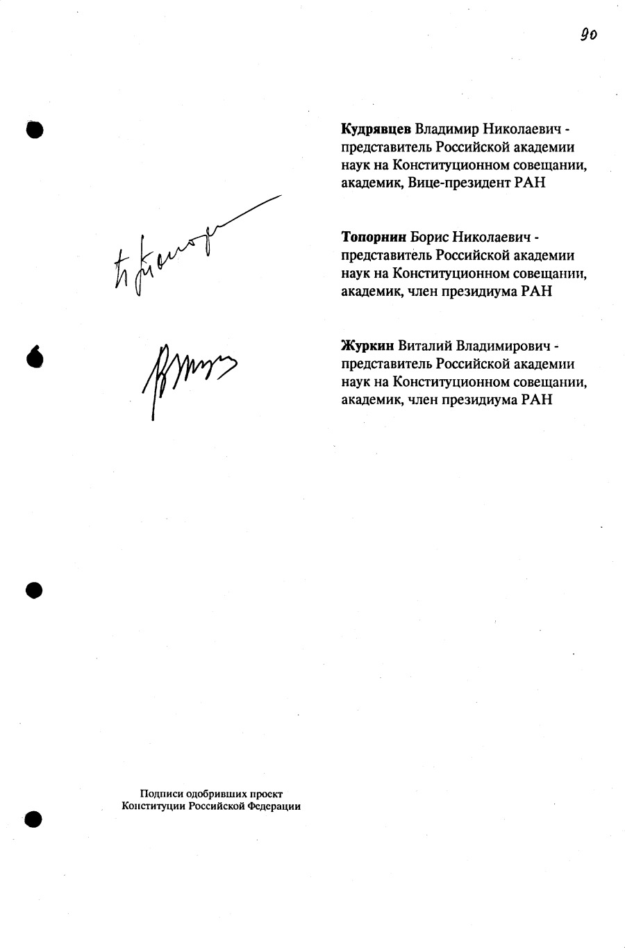 Проект Конституции РФ и подписи участников Конституционного совещания, одобривших этот проект 12 июля 1993 года (Президент РФ, Председатель ВС РФ, Председатель Конституционного Суда РФ, представители Президента РФ и СМ-Правительства РФ, народные депутаты)