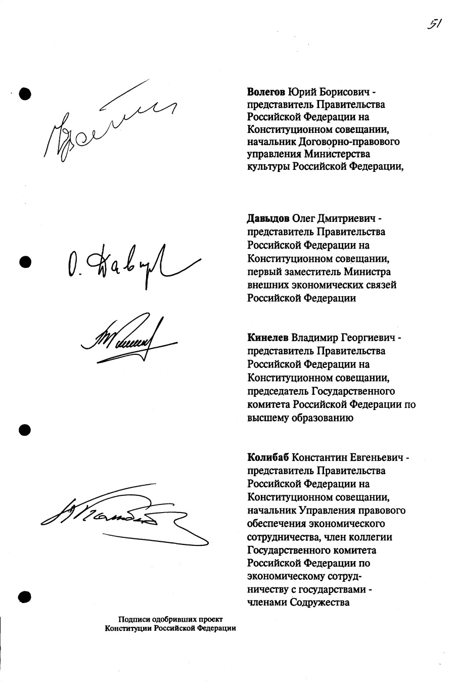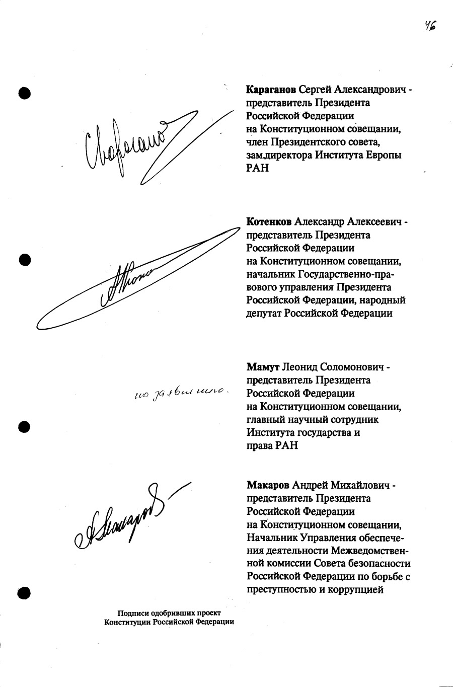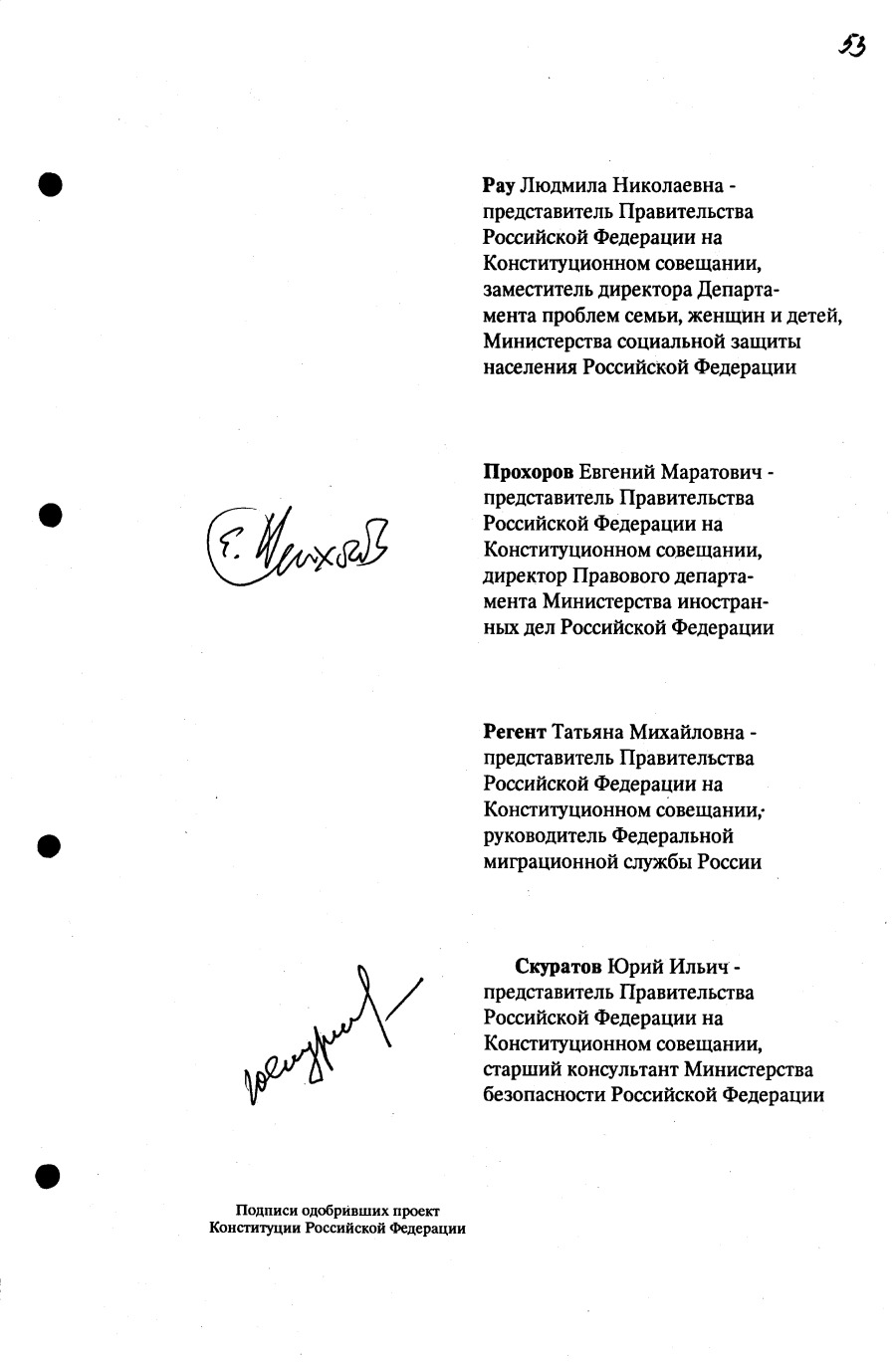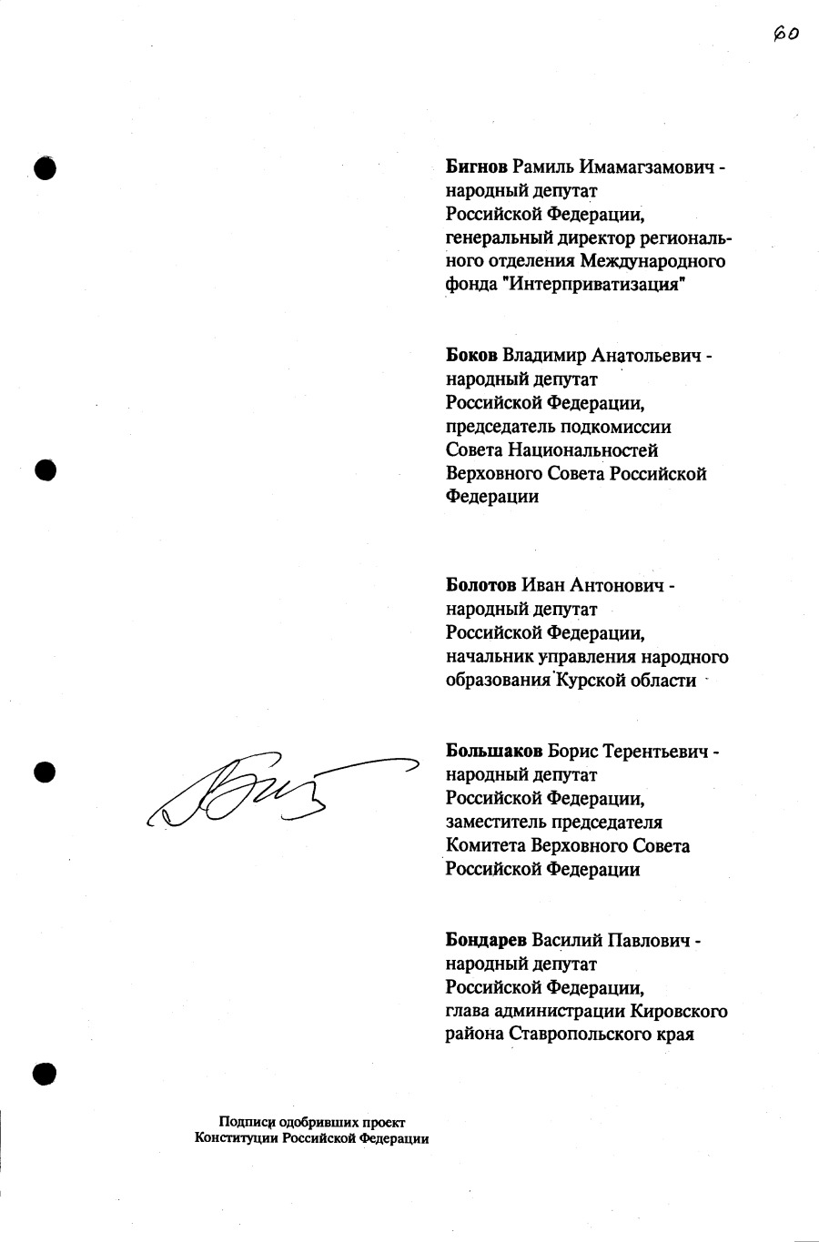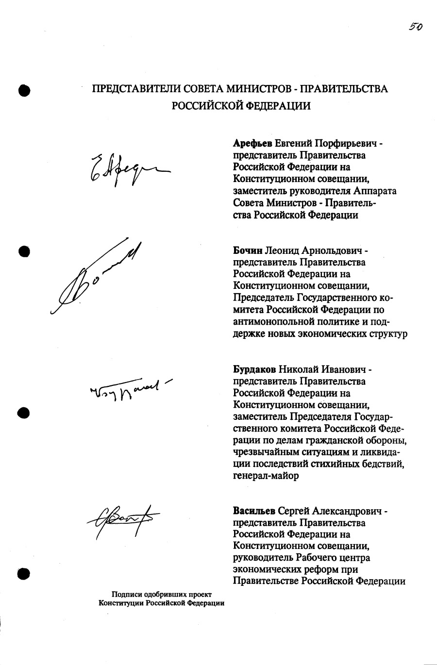 Проект Конституции РФ и подписи участников Конституционного совещания, одобривших этот проект 12 июля 1993 года (Президент РФ, Председатель ВС РФ, Председатель Конституционного Суда РФ, представители Президента РФ и СМ-Правительства РФ, народные депутаты)