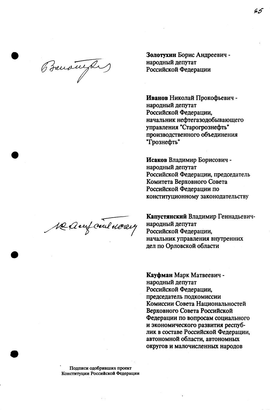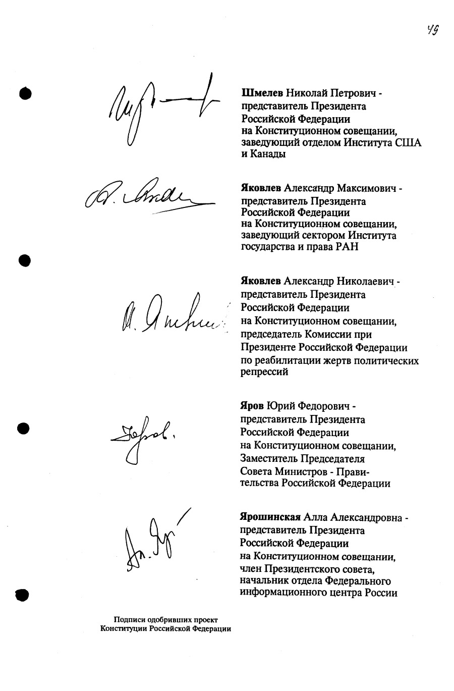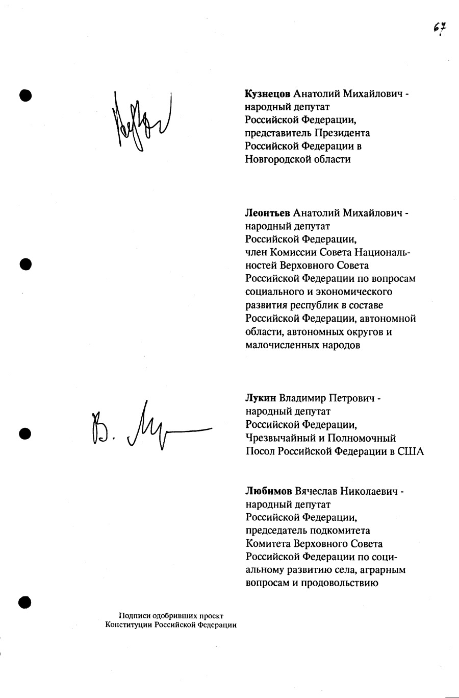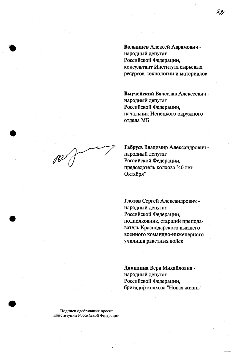 Проект Конституции РФ и подписи участников Конституционного совещания, одобривших этот проект 12 июля 1993 года (Президент РФ, Председатель ВС РФ, Председатель Конституционного Суда РФ, представители Президента РФ и СМ-Правительства РФ, народные депутаты)