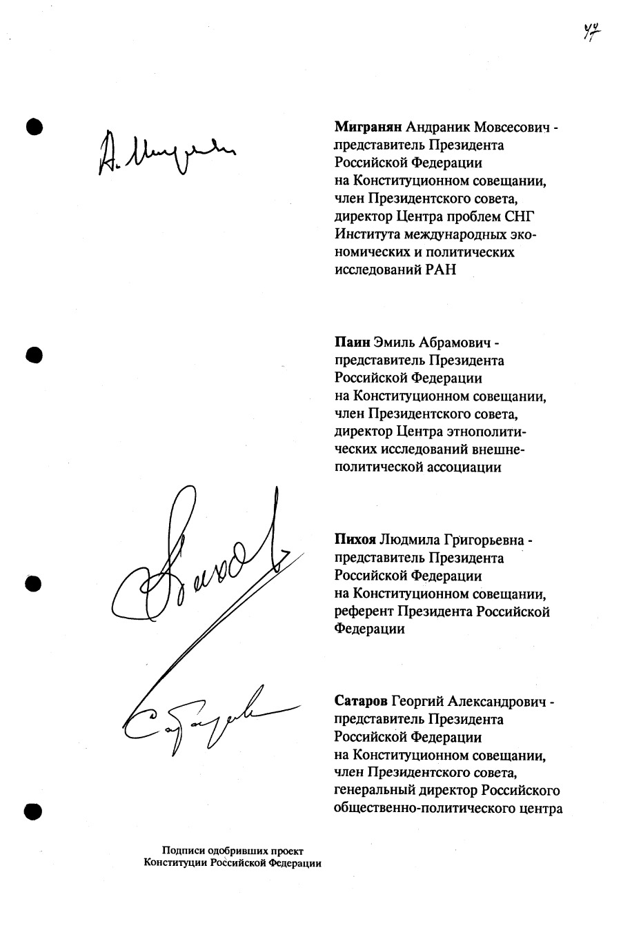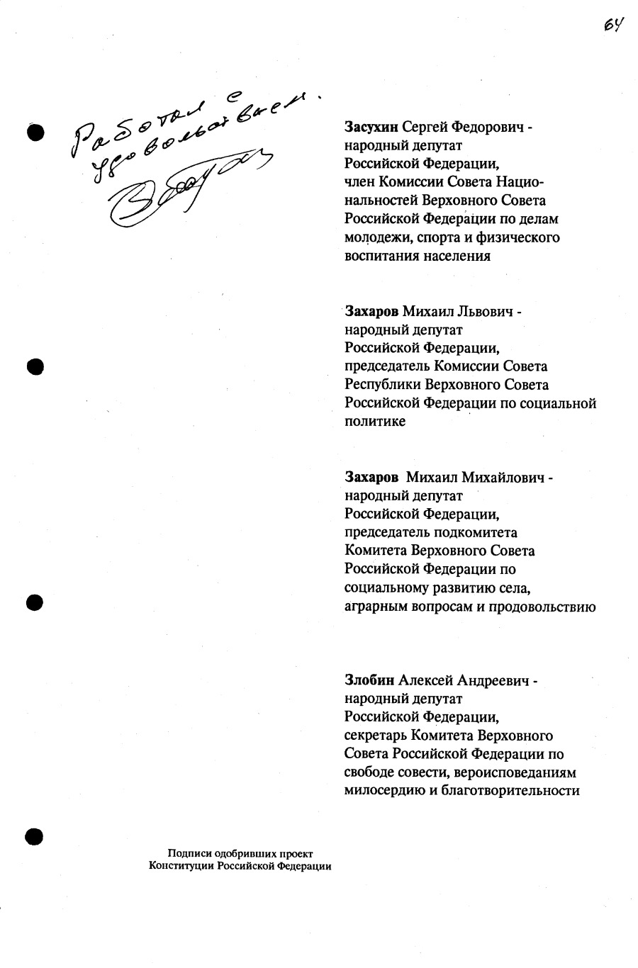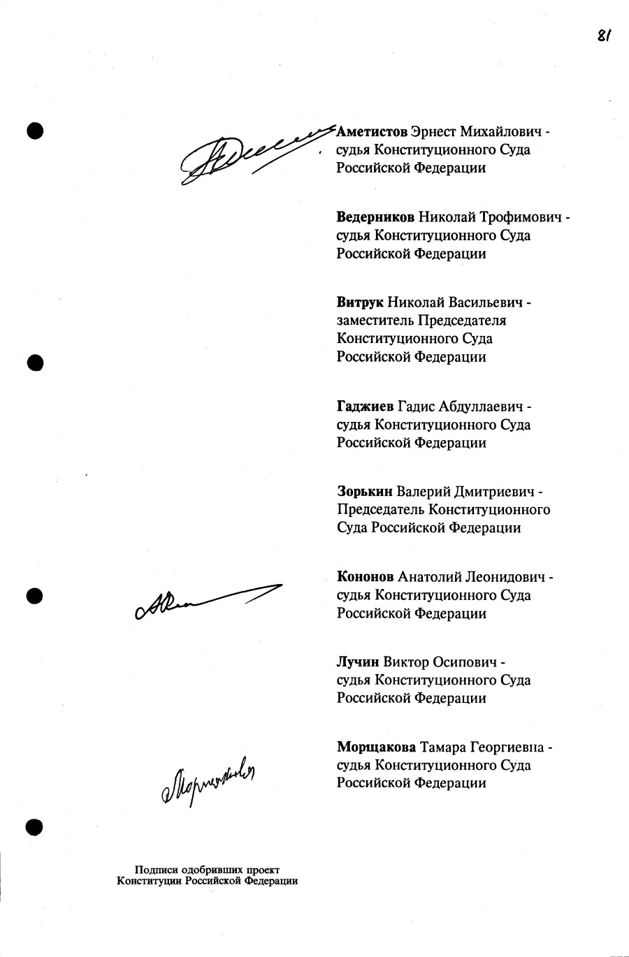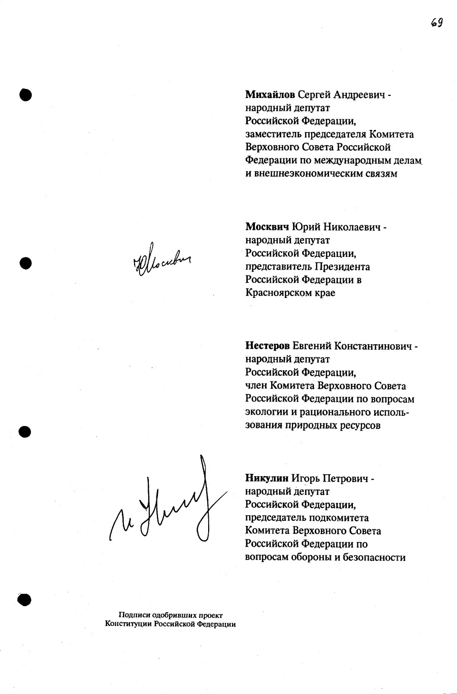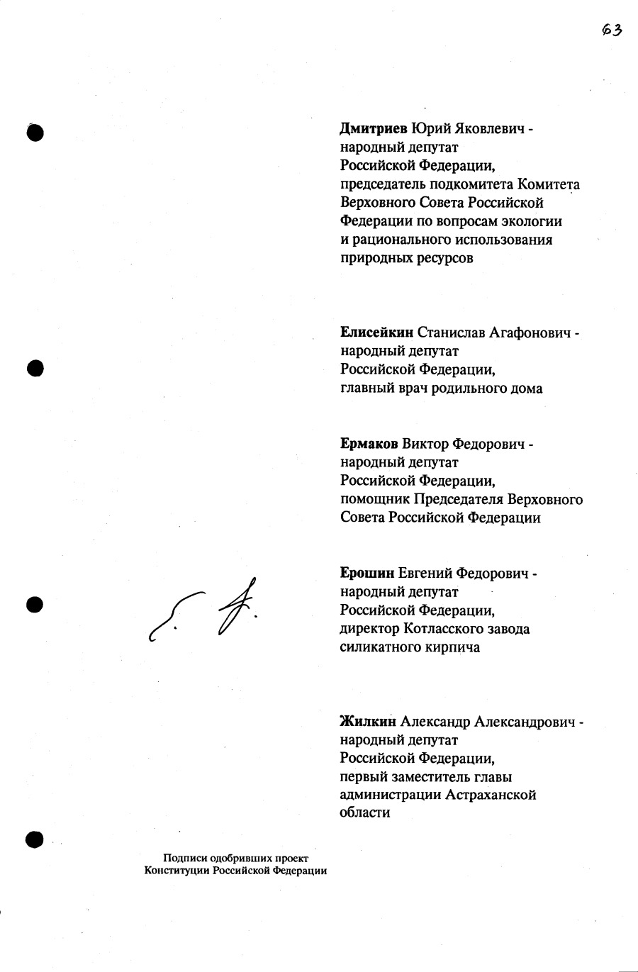 Проект Конституции РФ и подписи участников Конституционного совещания, одобривших этот проект 12 июля 1993 года (Президент РФ, Председатель ВС РФ, Председатель Конституционного Суда РФ, представители Президента РФ и СМ-Правительства РФ, народные депутаты)