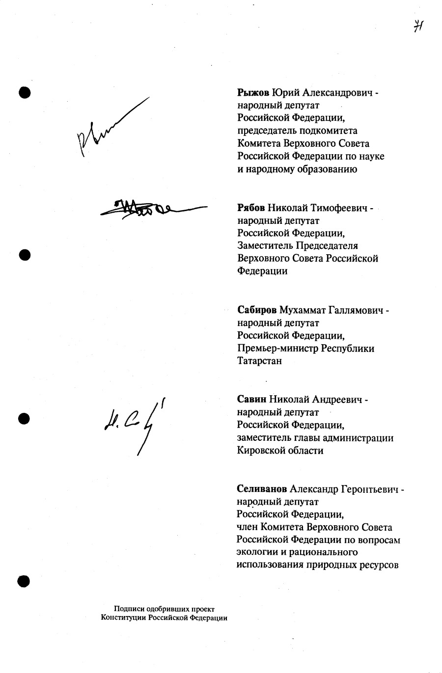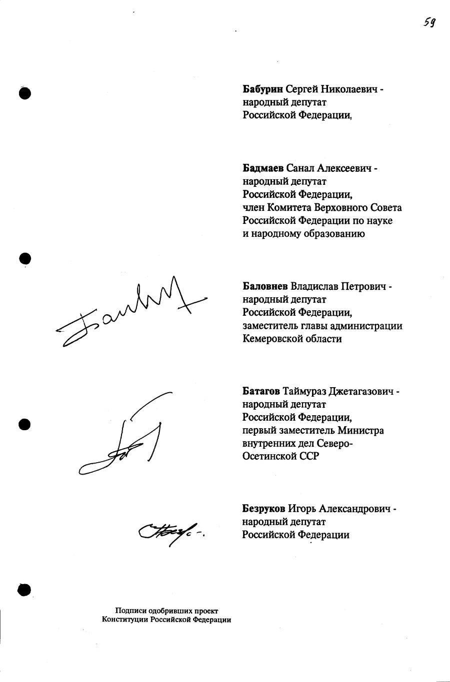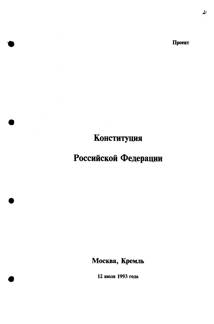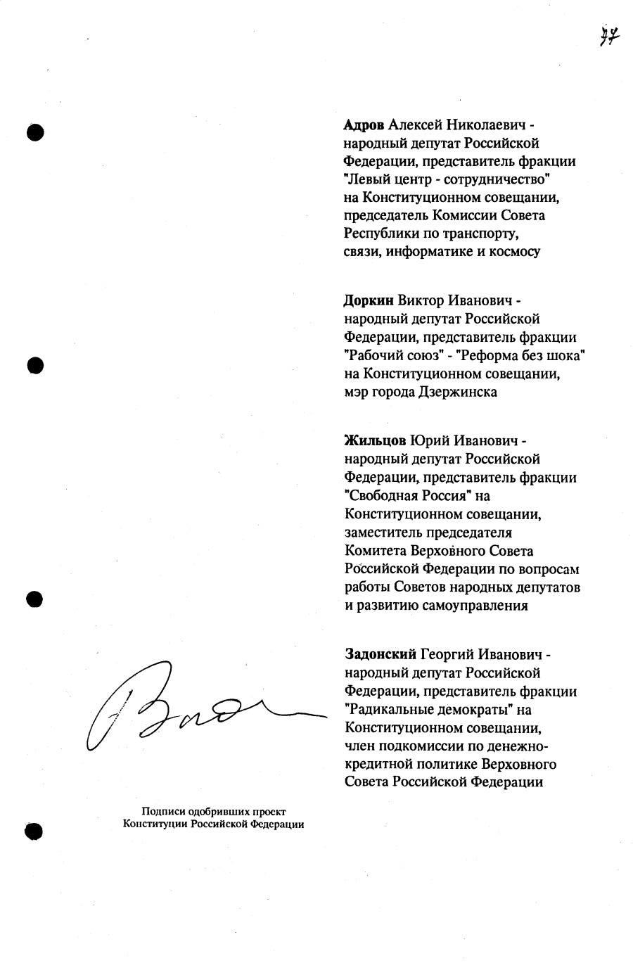 Проект Конституции РФ и подписи участников Конституционного совещания, одобривших этот проект 12 июля 1993 года (Президент РФ, Председатель ВС РФ, Председатель Конституционного Суда РФ, представители Президента РФ и СМ-Правительства РФ, народные депутаты)