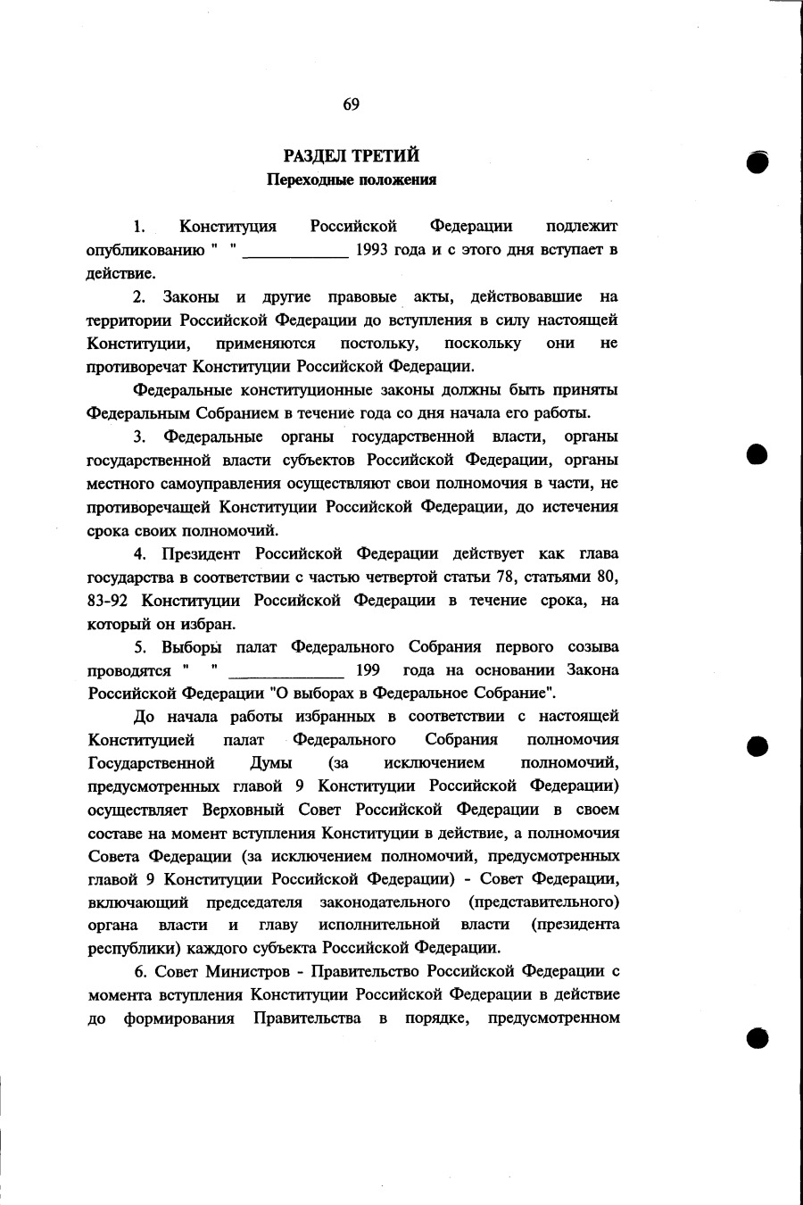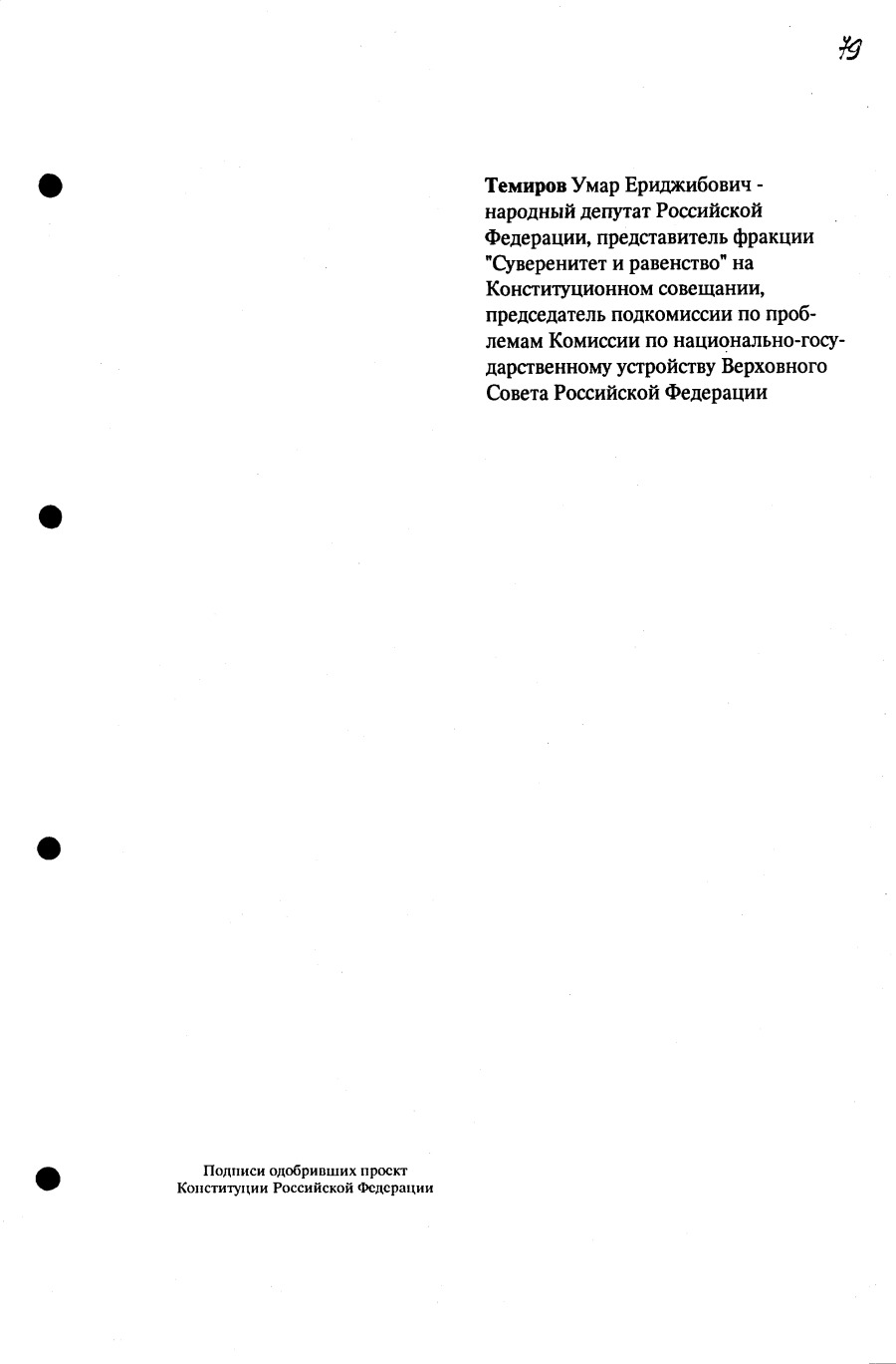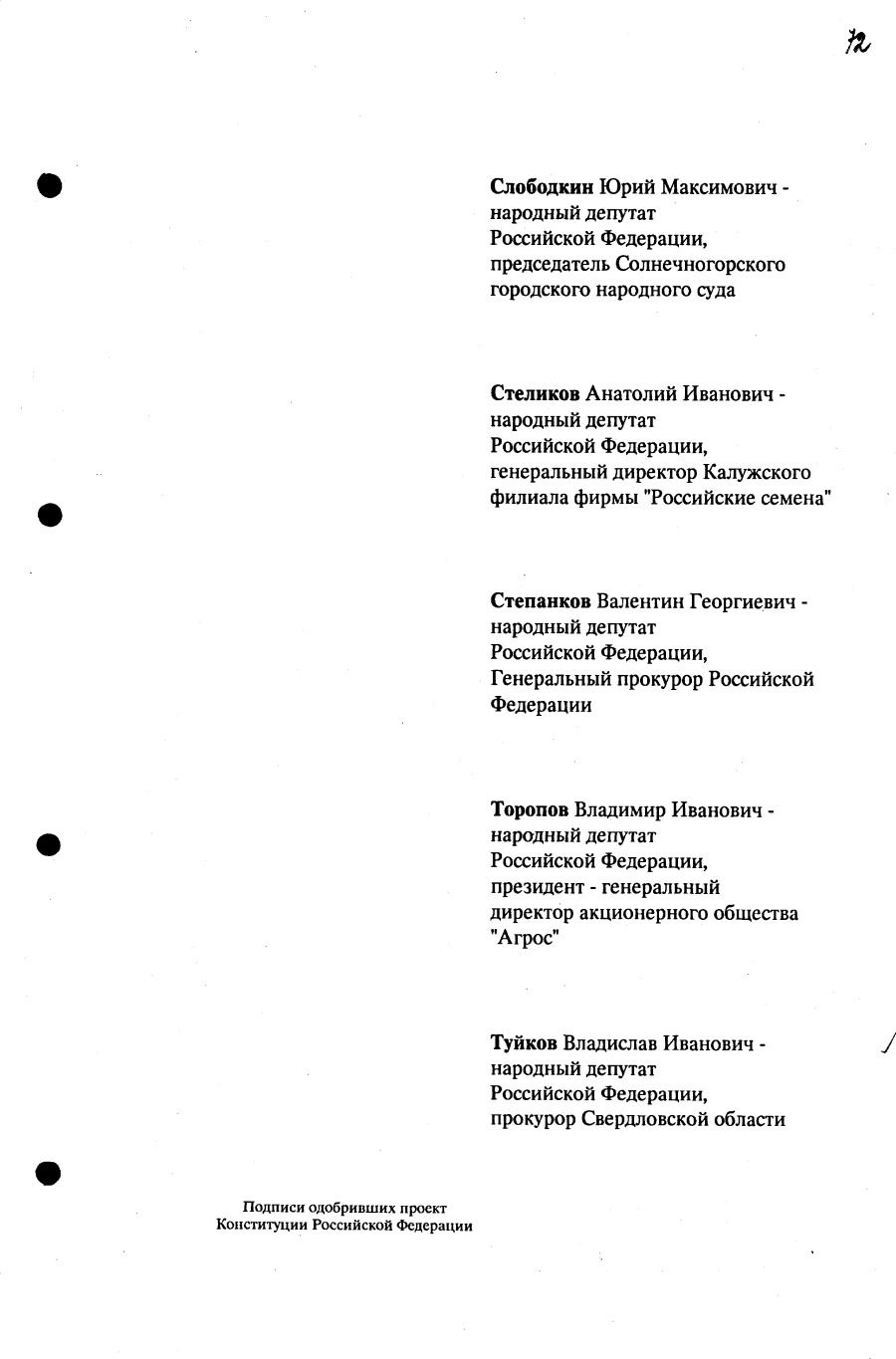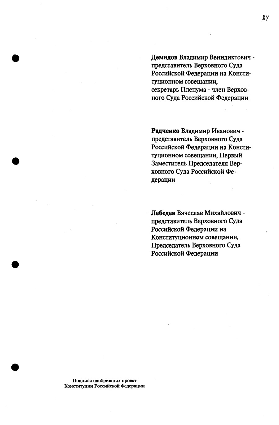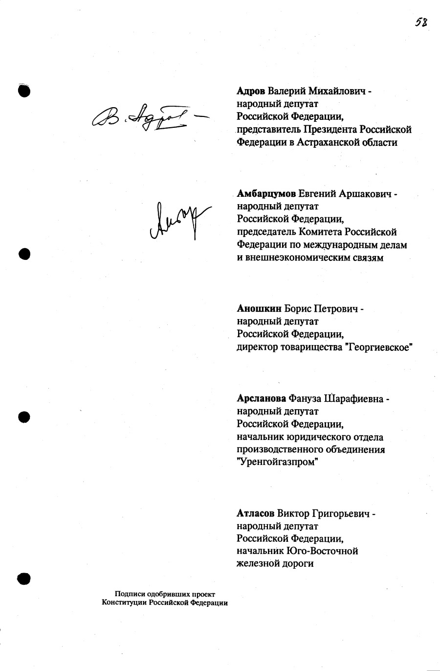 Проект Конституции РФ и подписи участников Конституционного совещания, одобривших этот проект 12 июля 1993 года (Президент РФ, Председатель ВС РФ, Председатель Конституционного Суда РФ, представители Президента РФ и СМ-Правительства РФ, народные депутаты)