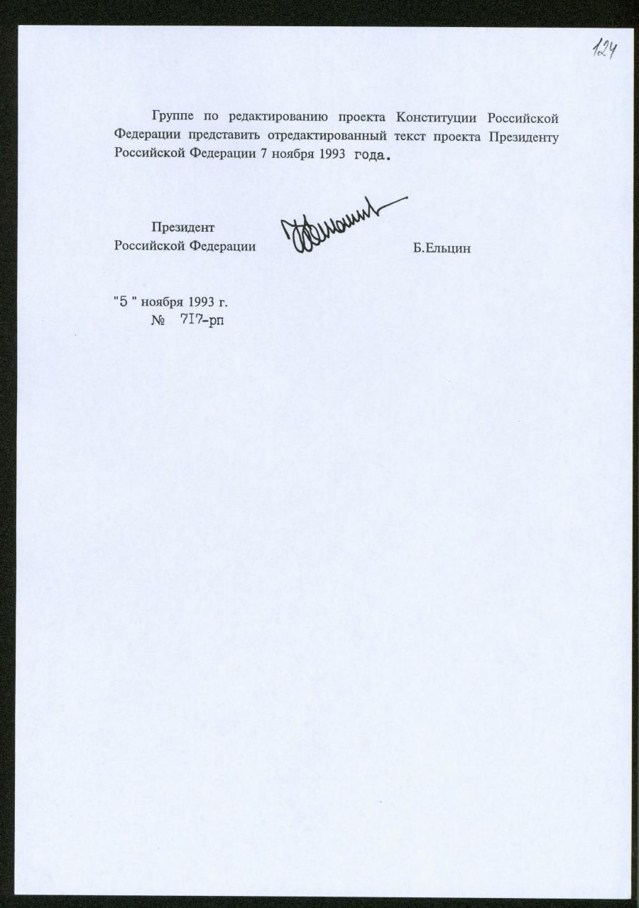 Распоряжение Президента Российской Федерации № 717-рп «О завершении работы над проектом Конституции Российской Федерации».