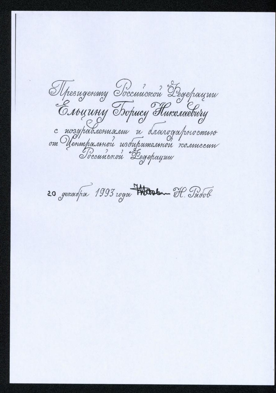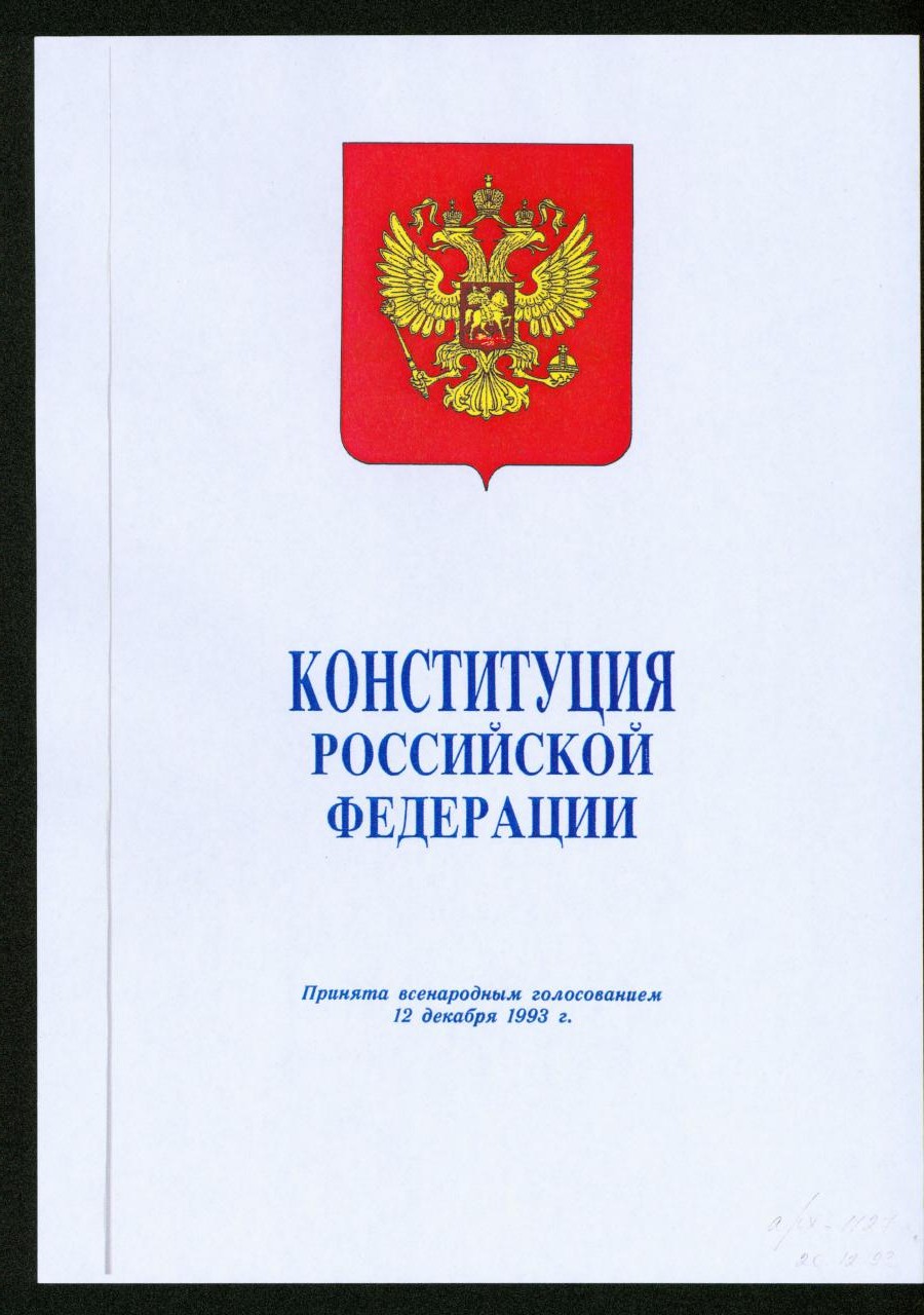 Экземпляр Конституции Российской Федерации Центральной избирательной комиссии, принятой всенародным голосованием с дарственной надписью Президенту Российской Федерации.